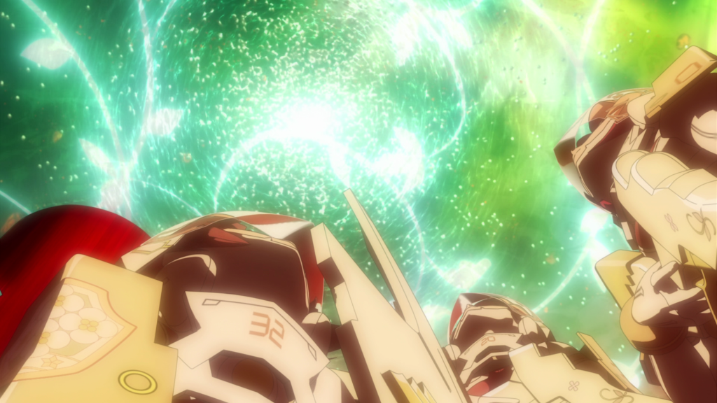 You get an action scene where the Sentinel fleet takes on an army of the lowest level Vertex. I’ll admit that it felt a little underwhelming compared to past YuYuYu action scenes but that may actually be the point. There’s no fancy weaponry at their disposal. Their ships aren’t powerhouses like Togo and Sonoko’s Mankais and they seem prone to permanent damage. Most of their tactics involve coordinating their attacks to suppress the enemies. The fact that there are dozens of these Sentinels means that they’re banking on numbers. All things considered, they act less like action heroes and more like a military unit. Perhaps that’s less exciting but it makes sense. These Sentinels are clearly not as strong as the Heroes we’ve seen in the past two seasons and any action involving them has to reflect that.
