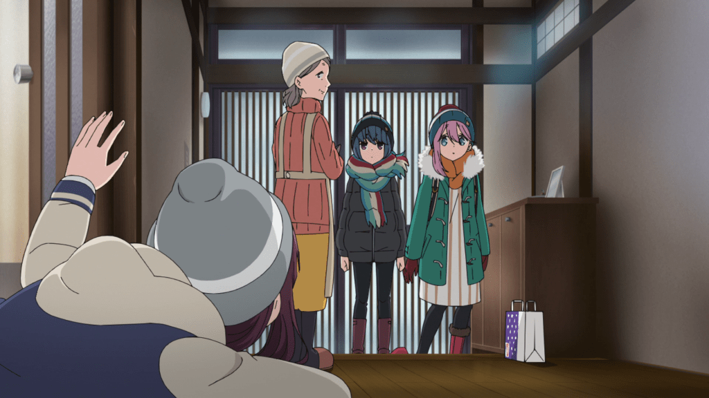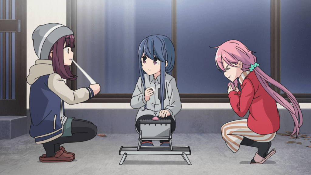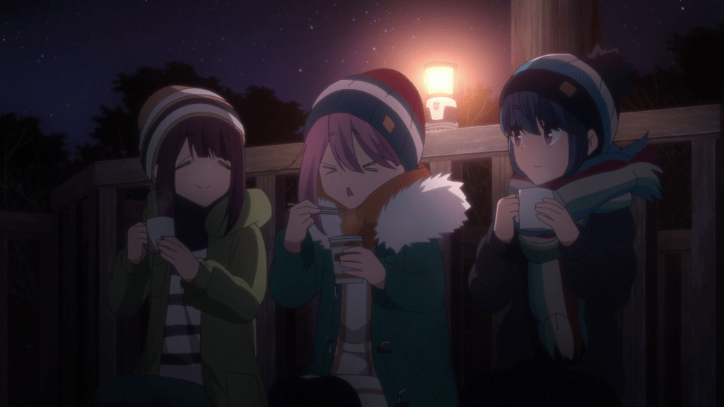 Near the end, Nadeshiko asks Rin about her solo trip and Rin gives a very thoughtful answer on both it and her feelings on camping in general. Despite admitting that camping with Nadeshiko and the others has been fun, Rin remains enamored with the idea of camping solo, remarking that the loneliness is its own sort of catharsis different from a group trip. I doubt Rin really thought back and forth on this, nor was this New Year’s adventure serving as a raincheck on whether she’d still enjoy camping by herself. She’s always felt this way and I doubt that’s going to change. Still, it’s satisfying to hear Rin affirm her feelings in her own words. I also love Nadeshiko’s response, she’s always been supportive of Rin’s solo camping but judging by the conversation, it sounds like Rin has given her food for thought that never crossed her mind before. Had the Season 1 ending not been retconned, I can see this conversation being a catalyst towards Nadeshiko giving solo camping a try.