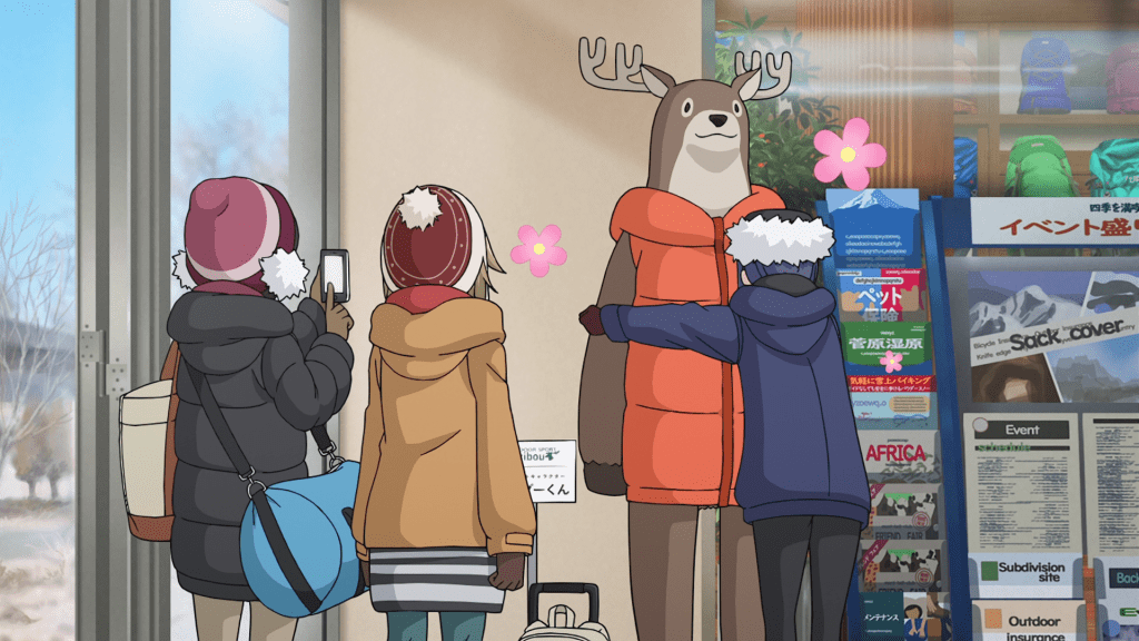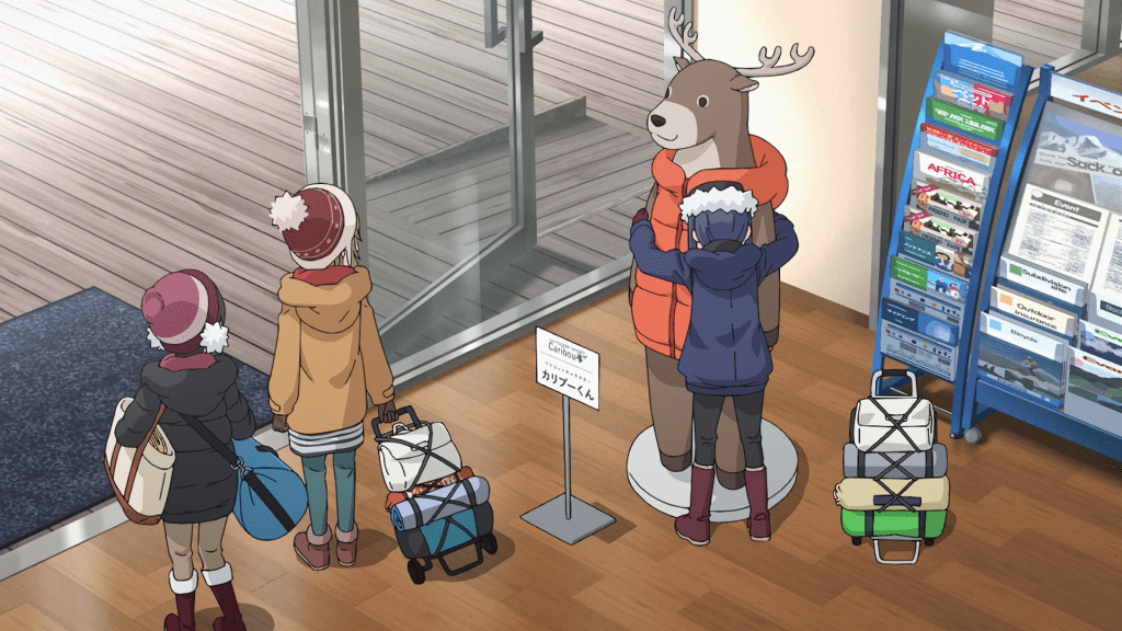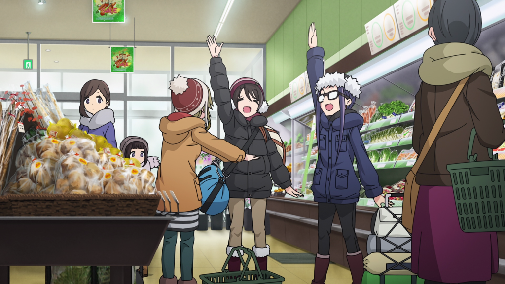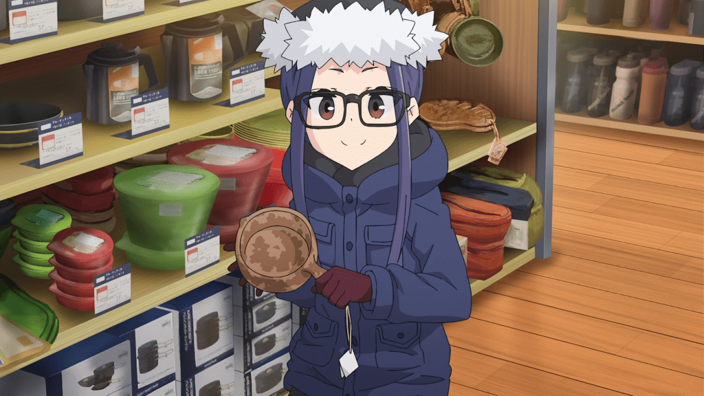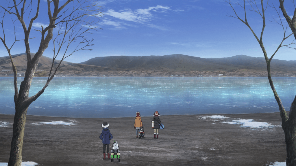 In this episode, Ena joins Chiaki and Aoi for a camping trip to Lake Yamanaka. Along the way, they get some stuff at a Caribou and buy kiritanpo and wakasagi ingredients for dinner. It’s only until the end of the episode that they make it to their destination. Nadeshiko and Rin have work so they unfortunately can’t make the trip. Chiaki plans to send the two pictures of the trip to make them jealous though I kind of doubt that’s how it’ll go. Like, maybe Nadeshiko will be a little envious but she’s more likely to be happy for her friends. I doubt Rin is going to care all that much.