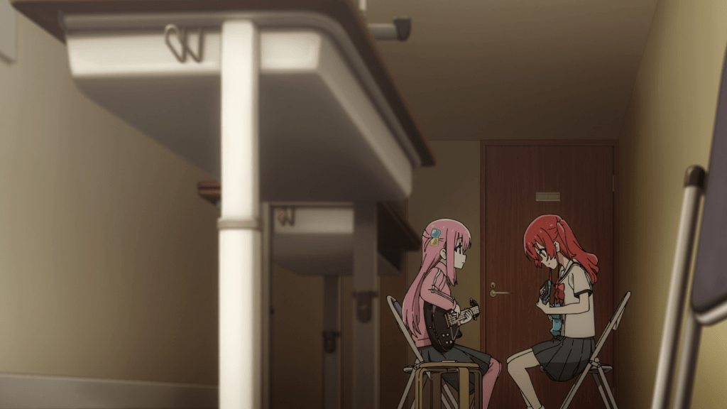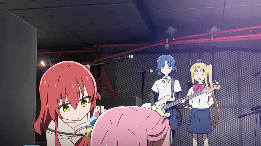 Right before the audition, there’s a great heart to heart conversation between Bocchi and Nijika. At first, I thought this would have Bocchi having doubts about her performance and Nijika would give her a pep talk. To my surprise, Nijika begins with an apology to Bocchi, on the chance that her friend feels forced into going along with her antics. Obviously, Bocchi doesn’t feel that way but the fact that Nijika has this concern says a lot about her. It goes to show how considerate she is of Bocchi’s feelings and how genuinely she wants to be her friend. At the end of the conversation, Nijika admits to Bocchi that a dream she had for the band was becoming famous but she also says that she a different goal in mind now. Nijika decides to keep the details a secret (in the most charming way possible, I might add) though based on the entire conversation, we can safely infer that it involves her feelings towards her friends.