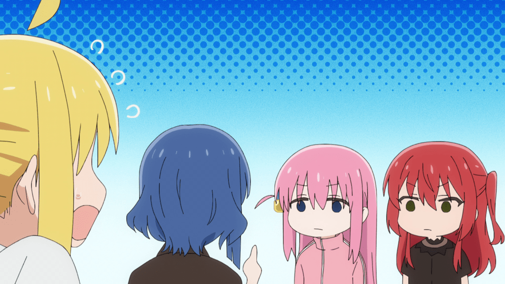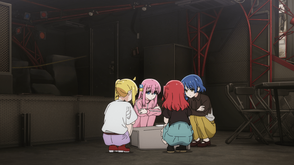 Episode 5 of BOCCHI begins with Kessoku Band getting their first paycheck from working at Starry. Bocchi hopes to indulge in some shopping but unfortunately for her, the band is giving Laid-Back Camp‘s Outclub a run for their money in how tight they are with money (though at least these girls have money…for now). The band needs money for their next performance as well as other endeavors they’d like to pursue. On the flipside, Ryo created instrumentals to go along with the lyrics Bocchi wrote in the last episode so the gang has completed their first original song. Now, they just need to perform it…which brings us to the main plot of this episode.