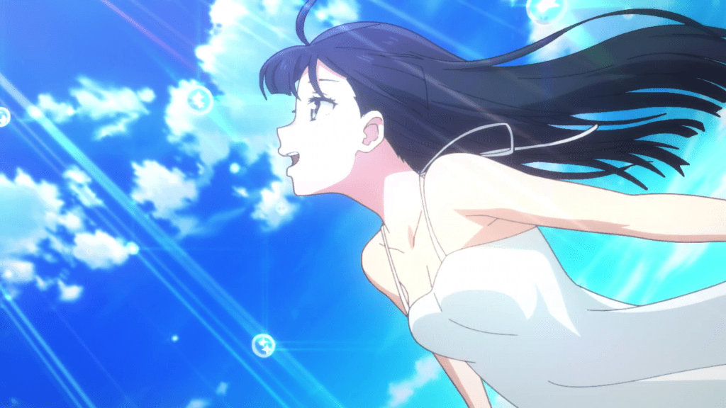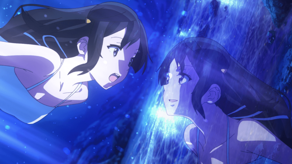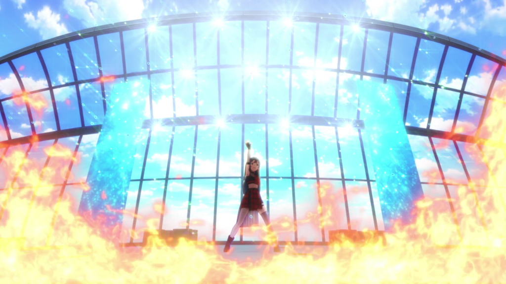 The music performances continue to confuse me a bit here. In the case of Setsuna’s performance this episode, it’s implied that she’s singing on that balcony in front of the whole campus but that actually comes across as rather awkward when you think about it. One, there’s no way the instrumentals accompanying Setsuna’s vocals or any of the stylistic imagery is happening in-universe. And two, I can’t imagine the crowd hearing Setsuna very well unless they have really good hearing, Setsuna is singing really loudly, or the gang had speakers set up in advance. Regardless, it’s a darn good performance. I like the clashing imagery of the fire and water as well as the visual of Setsuna swimming in an ocean and seeing her reflection. It really captures the double life she lives and how she’s setting herself free by becoming an idol again. Also, Tomori Kusunoki is killing it with her vocals in this show. I’ve enjoyed her singing before in other anime but man was she a good pick for Love Live!.