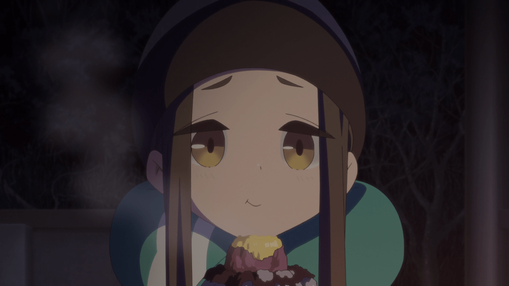 Season 1’s ending was brief so this episode provides a more earnest take at how Nadeshiko would camp on her own. This episode certainly makes more use of Nadeshiko’s clumsiness. She falls over, she stubs her foot with one of her tent’s poles, she accidentally bends one of her pegs (though, she is able to fix it). The only clumsy act Nadeshiko does in Season 1’s ending was hit herself with a rock (though to be fair, that is in-character of her to do). Also fitting of Nadeshiko to do is experimenting with cooking ingredients to pass the time. The girl loves food after all and she also loves sharing that joy with her friends so this checks out. I did expect her experimenting to bit more, well, experimental. All Nadeshiko does is just warm individual vegetables up to see how well they taste when cooked. It makes sense; I just imagined things to get whackier.