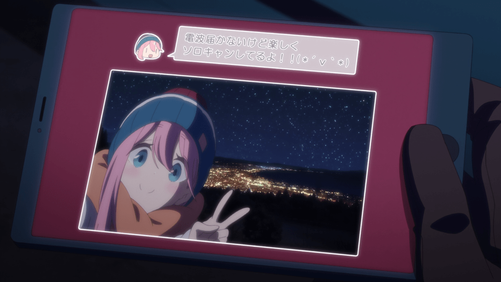 It feels a little silly how long it has taken for Nadeshiko to camp solo but maybe it feels that way because Laid-Back Camp technically had Nadeshiko camp solo already in Season 1’s ending. Regardless, Nadeshiko’s trip finally begins in earnest with this episode having her arrive at her campsite, Fujikawa Health Ryokuchi Park in Fujinomiya. I got to say, Nadeshiko sure did her homework. The weather seems nice. The bathrooms are apparently clean. Campfires aren’t allowed but the park does have a designated are for cooking. All these perks are things Rin recommended for Nadeshiko to look for online and it seems like the latter really did take the advice to heart. The only thing Nadeshiko seems to have overlooked is the internet reception, which becomes a relevant detail later in the episode.
