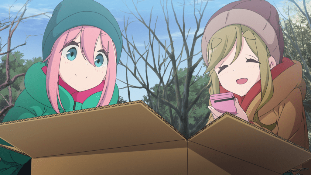 This OVA is hosted by Aoi, who introduces a series of strange camping events to the viewer. The fact that Aoi is presenting is perfect framing as all three of the following vignettes are the kind of nonsense that Aoi would make up for giggles. The first one has Nadeshiko and Aoi using a service app to deliver camping equipment to them. This doesn’t sound too weird, there probably does exist such an app as far as I know. That is until Aoi realizes that she forgot to have Chiaki delivered as well (and Chiaki is apparently trapped again in that cardboard sleeping bag from Season 1 Episode 4). Sadly, the OVA does not show Chiaki getting delivered to the campsite though the image of her appearing on the app is outrageous enough to sell the joke and it may actually be funnier to leave the delivery to your imagination.