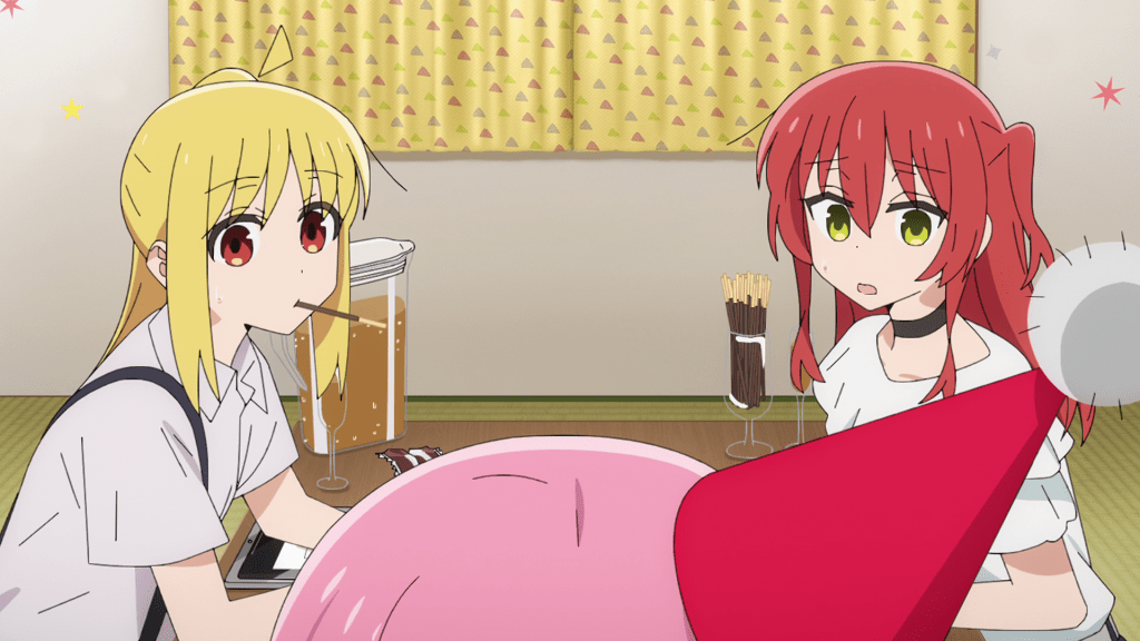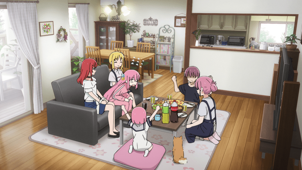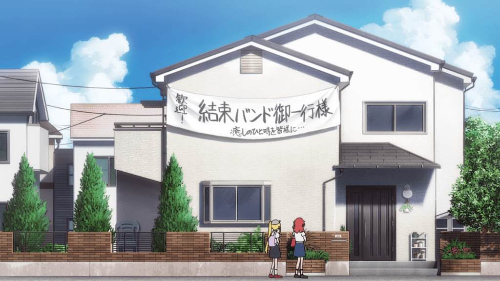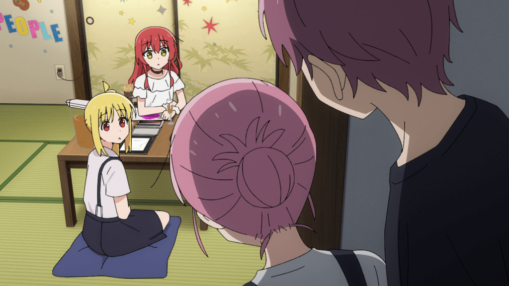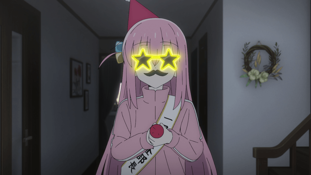 There isn’t really any reason as to why Nijika and Kita are specifically hanging out at Bocchi’s place apart. To be fair, it’s not like you need a fancy justification for friends hanging out at their friend’s home. The fact that hangout is at Bocchi’s is nevertheless important for the episode’s setup. As Bocchi points out, she’s never had friends at her place (or friends to begin with) so she has no clue as to how a hangout should go. And knowing Bocchi, she’s bound to go overboard. Unsurprisingly but also hilariously, Bocchi gets over the top here. She hangs a giant banner welcoming Kessoku Band at the front of her house. She puts on some silly accessories such a pair of LED sunglasses and a fake mustache. She decorates her room with party decorations. It’s all really ridiculous. As always, Bocchi’s heart is in the right place. She just doesn’t know how to go about with the execution and the results speak for themselves.