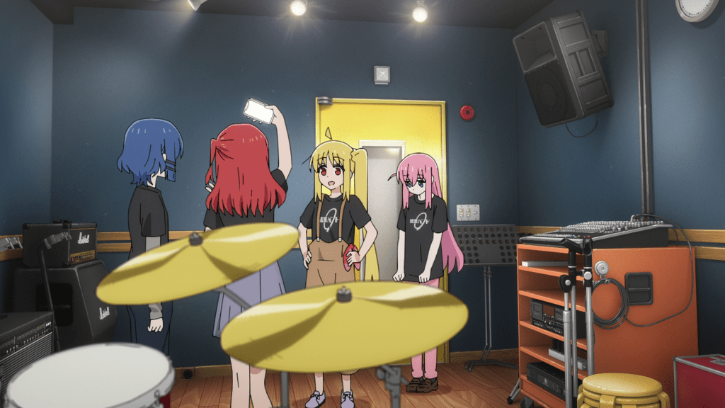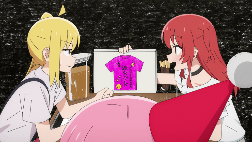 Ultimately, Nijika settles on her design, hilariously defeating the whole point of her gathering her friends to brainstorm. Joking aside, I like the shirt design. It’s a black shirt with a white zip tie encircling the kanji for Kessoku Band. The zip tie is what “kessoku” literally means, a punny symbol for the band’s bond, so its inclusion is appropriate. The design is simple but I dig it and it certainly looks like something a band would wear and sell. I imagine Nijika had to swallow her pride a bit here, however. She did say it in Episode 1 that she find her band’s name cringey. Then again, some time has passed. Maybe the pun has grown on her.