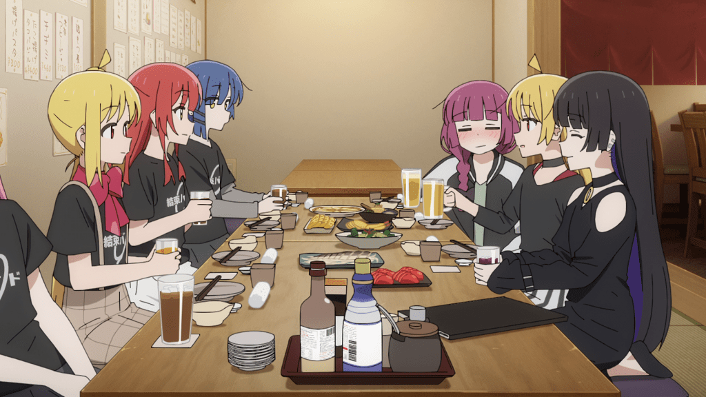 Surprisingly, the concert only makes up a third of the episode. The remainder is instead dedicated to the afterparty. Save for the ending, the afterparty is pretty much just banter between Kessoku Band, Starry, and Kikuri. It’s all good, though. My favorite is the cast finally bringing up Kita’s first name, Ikuyo. I’ve been calling Kita by her last name simply because that’s how she’s commonly referred as by the other characters though I have been wondering why she goes by her last name when Nijika and Ryo go by their first name and Bocchi goes by Bocchi. Now that I realize the pun with her full name, I can’t say I blame Kita for preferring her last name. Things got especially funny when the show draws her panicked face in the same vein as Bocchi’s. I can’t think of a better way to convey her insecurity.