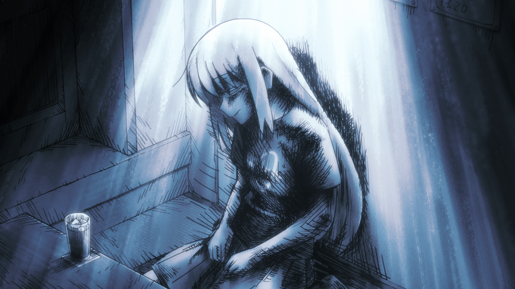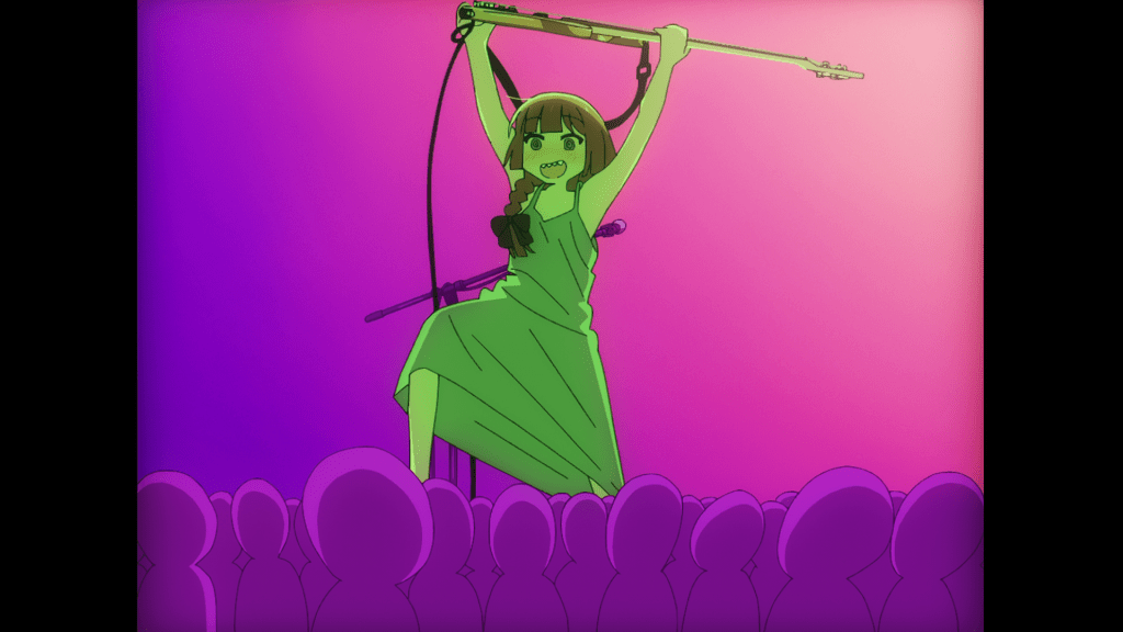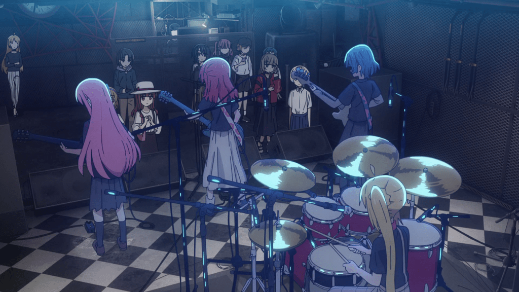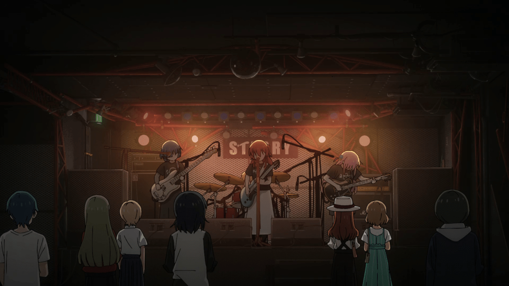 For the concert, Kessoku Band begins with “Guitar, Loneliness, and Blue Planet”. That’s a really good song and the characters in-universe performed it pretty well the first time around so it’s hard not to think that they might play it even better three episodes later. That doesn’t end up being the case, however. This is the band’s first real gig. They’re new to the scene and they have a lot to prove. To make matters worse, they have a small, unenthusiastic, and even rude crowd in attendance. I thought maybe having less people judging them could be a blessing in a disguise for Kessoku though the show makes it apparent that the smaller crowd makes the scrutiny more pronounced. With all this in mind, morale for the band is low and they begin to make mistakes in their performance. Bocchi notes these errors in her internal monologue. The show actually uses a deliberately worse recording of “Guitar, Loneliness, and Blue Planet”. By far the most heartbreaking cue is the reaction of Bocchi’s fans. They’re right in front of the stage trying to enjoy the music but even that fades away as the song goes on (though don’t worry, that changes by the next song).