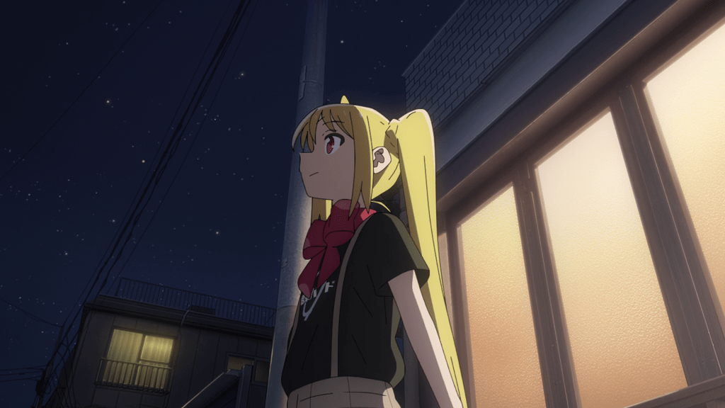 For the end of the episode, we have a heart-to-heart conversation between Bocchi and Nijika. Nijika informs Bocchi that she finally realizes that the latter is guitarhero. Bocchi apologizes for keeping her identity a secret and explains that she didn’t want to reveal it until she “fixes” the way she is and is deserving of her online name. I’m honestly surprised to hear Bocchi say this. Despite her personal growth and her close friendship with Nijika, she’s still afraid that her friend won’t completely accept her. Fortunately, this lingering bit of doubt is put to rest. Nijika explains to Bocchi that Seika raised her in their parents’ stead and that she inspired her older sister to play in a band and later create Starry. Her dream then is to form a band that’ll make Starry famous. However, it’s only until Bocchi entered her life that Nijika feels like her dream is feasible. Without Bocchi, Nijika thinks the band wouldn’t have made as much as progress as it has so far. In her eyes, Bocchi is irreplaceable and completely deserving of her guitarhero persona.