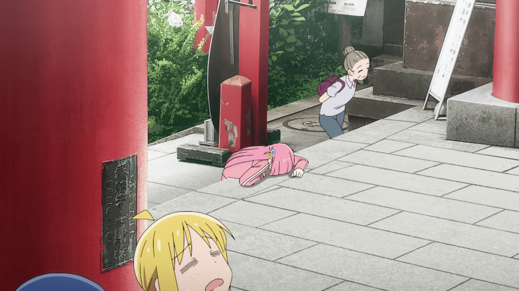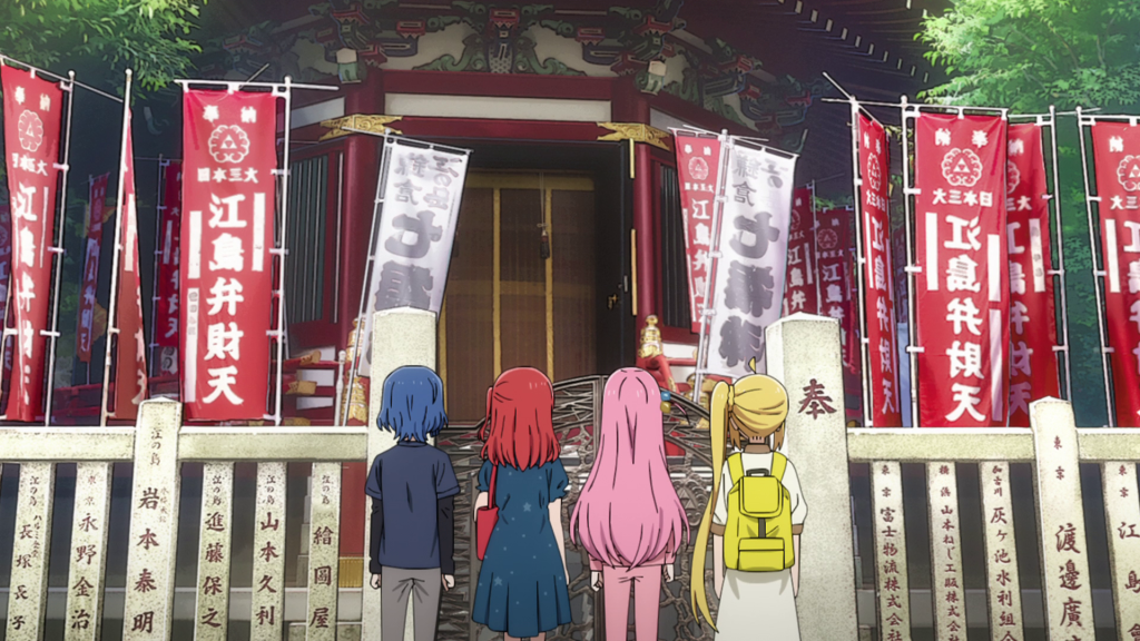 I think the most surprising thing about this episode is that it isn’t a beach episode. The girls do go to the beach but they’re only there for like a minute. They don’t even change into swimsuits. I’m surprised at this because years of anime, especially CGDCT has conditioned me to just expect a full on beach episode. What we instead have is Kessoku Band touring around some of the different points of interest in Enoshima such as Enoshima Shrine and the Enoshima Sea Candle. Kita encourages the whole gang to walk up the Enoshima Shrine’s stairs, insisting that the scenery will be more worthwhile if they work their way to see them. They try for a bit but hilariously, everyone besides Kita is like “screw that” and decides to take the Enoshima Escar instead. I want to say Kita plays the role of the straight man but I side more with the others so maybe she’s the crazy one instead. Another funny moment is when Kessoku Band goes to the top of the Sea Candle, only to immediately go back down to ground level, much to Kita’s chagrin. The view from that high up really looks nice and most of the characters here don’t care. I guess Kita is the only one who frequently goes outside.
