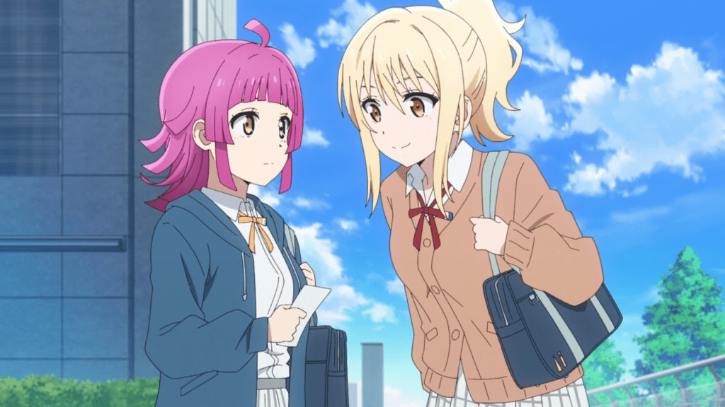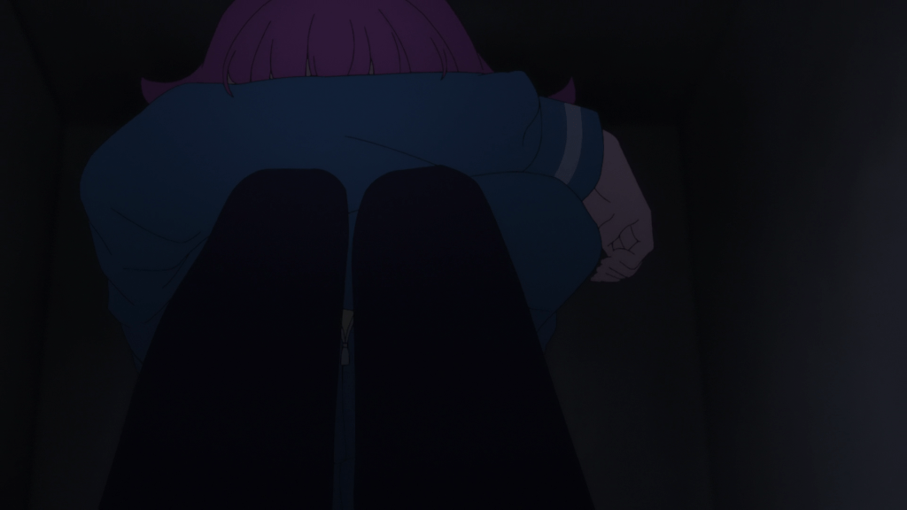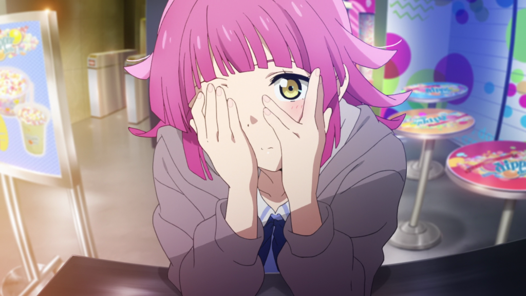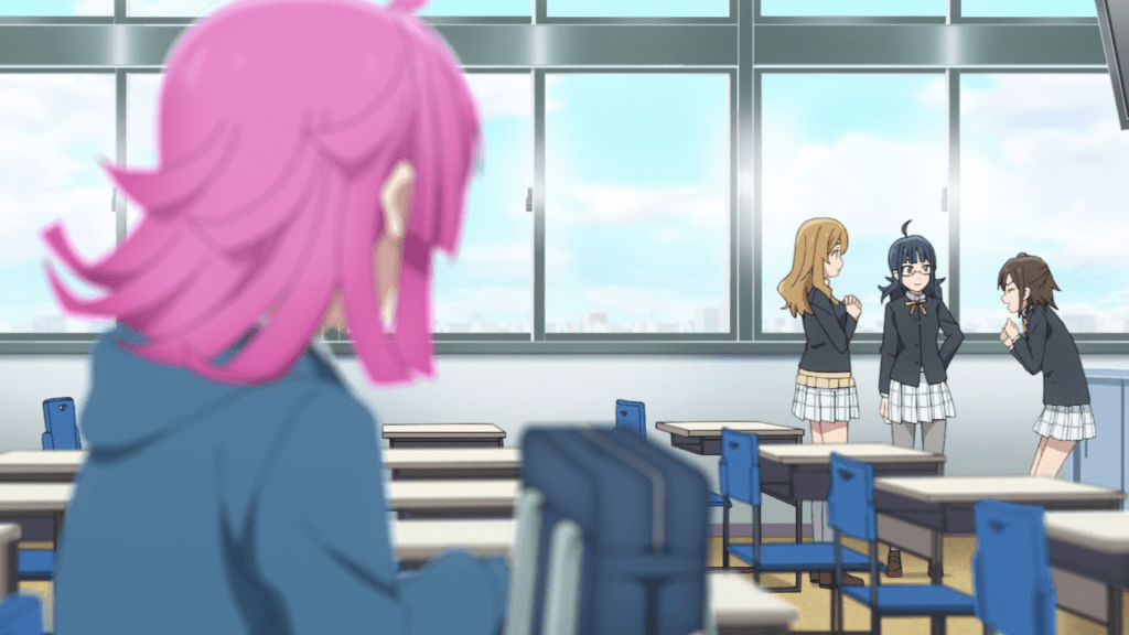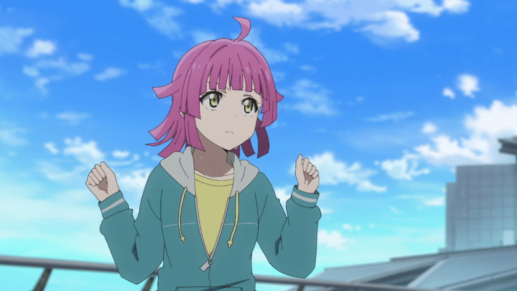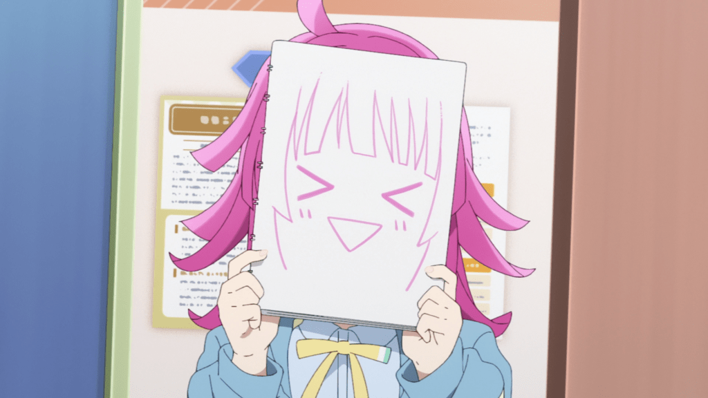 For what it’s worth, I think the staff did a great job designing an arc that establishes Rina’s gimmick. In the episode, you learn that some people, including three of Rina’s classmates that she’s been trying to befriend, are anticipating Rina’s idol debut after seeing her PV in which she presents herself with a virtual avatar. Rina then decides to schedule a concert at a recreational center and begins to train vigorously for it in the hopes that it’ll change her for the better. While the training certainly makes her a better idol, Rina notices that she still can’t express herself and she begins to think that her efforts are in vain. This plot is of course resolved with the creation of the Rina-chan Board, the gimmick being framed as Rina using her strengths to overcome her weakness as well add a lot of personality and individuality to her idol persona.