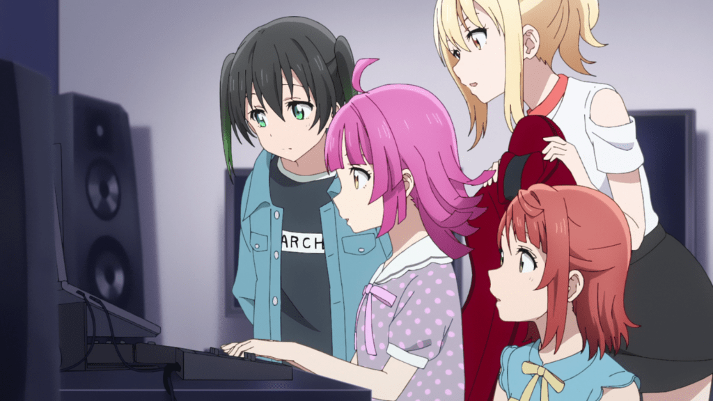 Naturally, you also have the other members of the club help Rina overcome her struggle, with Ai and Yu leading the charge. Ai is Rina’s best friend so it makes sense to have her at the forefront in this episode. Knowing Rina’s personality, you really come to see why she’s so close to Ai. Her friend’s more energetic personality is a source of inspiration for her. It also makes sense that Ai is her first friend; the girl is so outgoing that of course she’d befriend Rina. As for Yu, I’ve been wondering what to make of her but one thing that is clear is that she does tend to say the right thing at the right time. Case in point, her telling Rina that it’s okay that there are things she can’t do and inadvertently getting the others to bring up some of Rina’s strengths. I also really like that Yu is the one who puts the headset onto Rina, effectively illustrating her role as the manager and supporter.