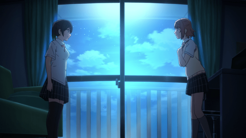 Along the way, we have Ayumu continuing to mope over Yu. She does her work like everyone else but it’s clear in some scenes that she still isn’t that enthusiastic about the festival, primarily because it’s making Yu so busy. Like with the last episode, Ayumu grows jealous or at least worried of Yu spending time with Setsuna though this episode does make a stronger case for Ayumu for feel that way. As mentioned earlier, Setsuna helps Yu with revising the club’s pitch. Being the student council president, she’s bound to provide some valuable input. I can see Ayumu feeling less qualified to help when compared to Setsuna. Things come to a head when Ayumu learns from Setsuna about Yu practicing the piano. Apparently, this is something Ayumu didn’t know about. There’s a bit of a misunderstanding here. Technically, Yu hasn’t told anyone, not just Ayumu, about her new hobby and Setsuna only found about it by complete coincidence. Also, I’m not sure why Setsuna tells Ayumu that Yu was playing the piano for her. Yu does play one of Setsuna’s songs but that was really for herself. Regardless, the fact that Yu neglected to share something to Ayumu is shocking enough to make the latter question if the former really is drifting away from her.