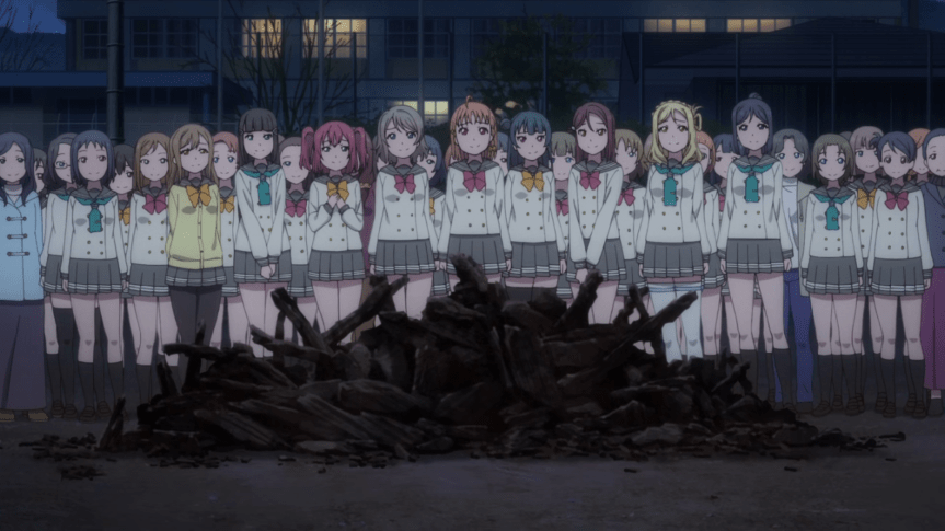 Fortunately, no one is upset with Mari. Everyone understands that she loves the school just as much as they do and that she tried her darndest to save it. All the extras cheering support for Aqours is a nice touch but what really gets me is seeing everyone sing this season’s ED together in front of the bonfire. I do mean everyone. Almost the entire additional voice cast, including Chika’s sisters (Kana Asumi and Kanae Ito) and even nameless extras, join Aqours for the last verse. I appreciate that the show goes the extra mile here and not just have Aqours sing as per usual. It’s really conveys a sense of solidarity, showing that it’s not just Aqours but rather the entire town. Everyone shares the sentiment regarding Uranohoshi’s closure, that this is an end of an era and that everyone must make their peace with it.