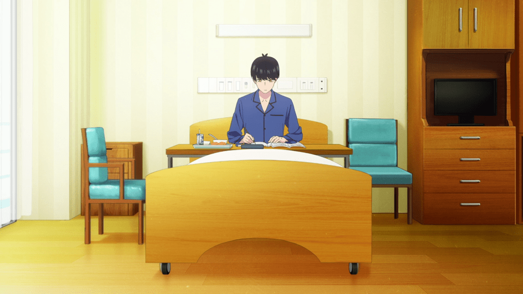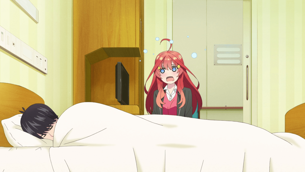 As for the story, we resume right where Season 1 left off (wedding flashforward aside, I mean). Following his illness in the last arc, Futaro (Yoshitsugu Matsuoka) recovers at a hospital which the Nakano family pays for (it’s heavily implied that the father is a doctor there). Each of the quintuplets pay him a visit at one point or another. Later, Futaro is discharged and learns that the sisters are back to being dumb so he’s back to tutoring them as always.