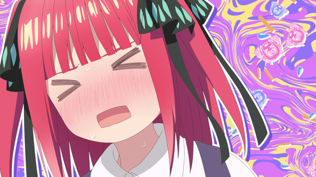 I’m not fond of how Nino behaved back in the day, as integral as it is to her arc, but it is fun seeing her act like this again. There’s a lot to like here: the fact that Nino thought this was a good idea, the plan backfiring on her, and her immediate regret and embarrassment that contrasts to how she used to take every opportunity to pick on Futaro. All of it is really funny. By far the funniest bit is when Nino thinks to herself that this is the first time she’s been mean to Futaro and the show fills the frame with snippets of her in Season 1 and the early episodes of Season 2. Clearly, this girl remembers the past differently than I do. To be fair, she is in love so I can see how her feelings can cloud her memories.