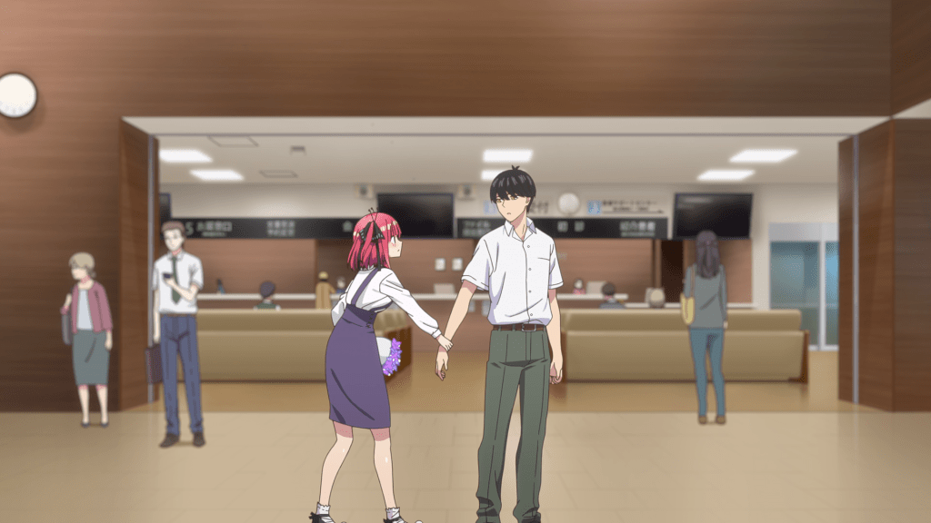 With summer vacation arriving, Futaro announces that he’ll take a break from tutoring the girls. Considering that we all get stupid after vacation, letting the girls put their studies on hold sounds like a risk to me. Then again, Futaro could use a mental break from dealing with the girls’ shenanigans on a presumably daily basis. Among the girls, Nino (Ayana Taketatsu) isn’t particularly troubled by the news as she works at Revival with Futaro. However, the plot quickly realizes this advantage over the other quints as the manager of Revival (Kousuke Toriumi) injures his leg and inadvertently throws a wrench at Nino’s agenda. The only time Nino sees Futaro before the trip to the pool is when they visit the manager at the hospital.
