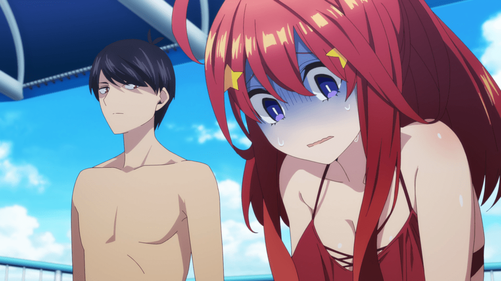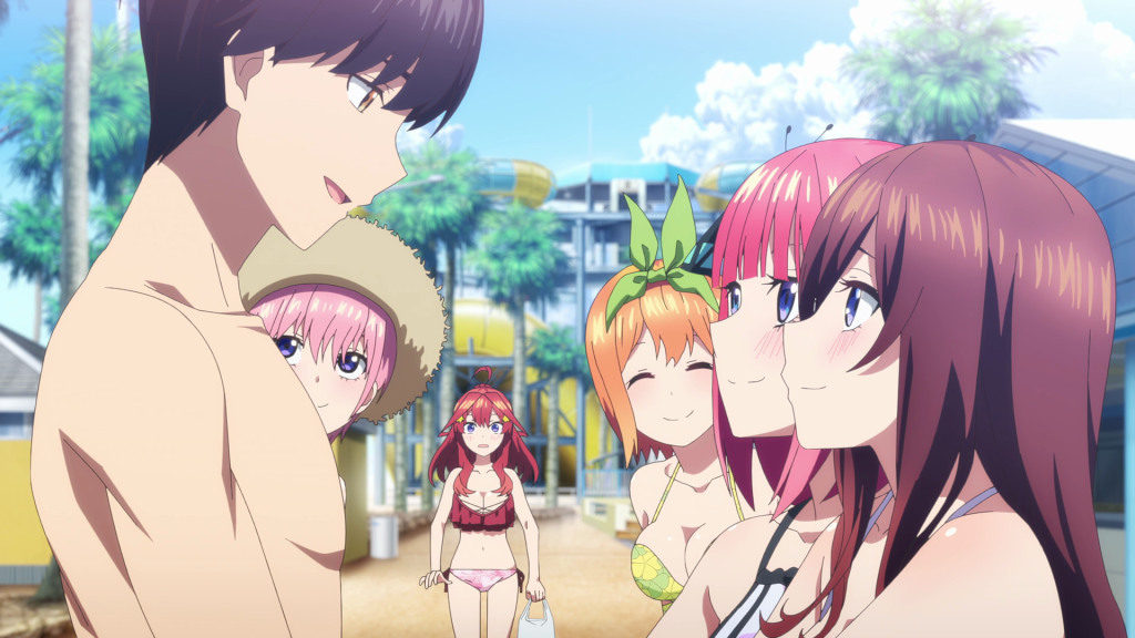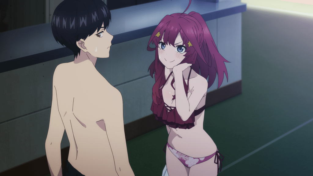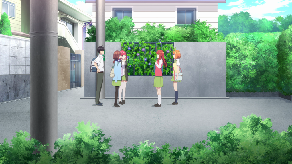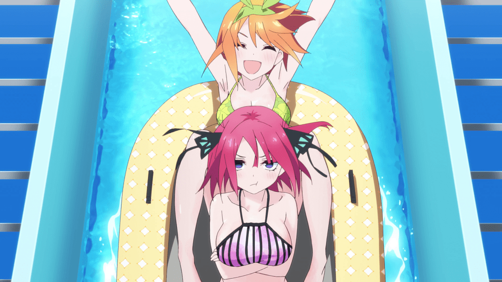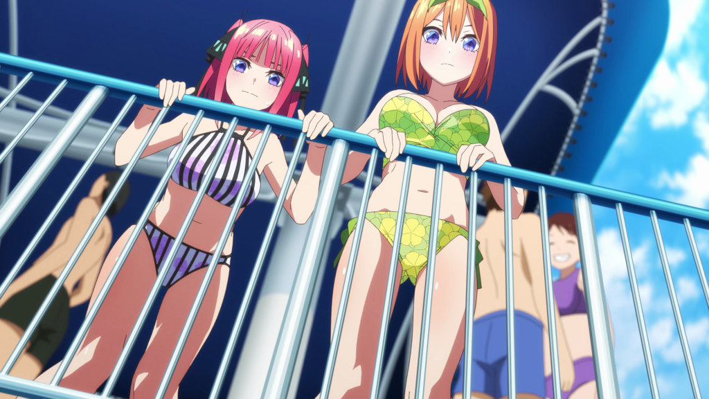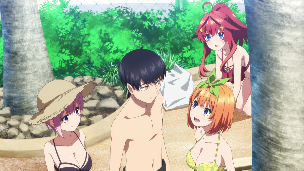 Episode 2 starts with Futaro and the quintuplets’ trip to a swimming pool. The movie does adapt this scene, albeit in a brief montage with its opening theme. From the movie version, you would think all there is to this scenario is fanservice and abridging it was an easy decision. As it turns out however, there is actually some character discourse to be found here. The trip to the pool is the first major group interaction between Futaro and the quintuplets after the Kyoto trip. Considering how the previous adventure went, Itsuki is concerned that her sisters will get into catfights again. She initially tries to keep Futaro all to herself but that quickly goes south once the others find them. Fortunately for her sanity, everyone is getting along just fine. The only potential landmine is when the gang has to divide into pairs for the water slide and that’s thankfully and humorously resolved by some good old Rock, Papers, Scissors. I took for it the granted this when I watched the movie version but this is a nice reprieve after the tension seen in the Kyoto trip and before we get to the final arc.