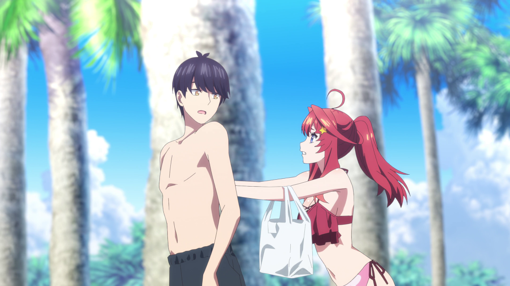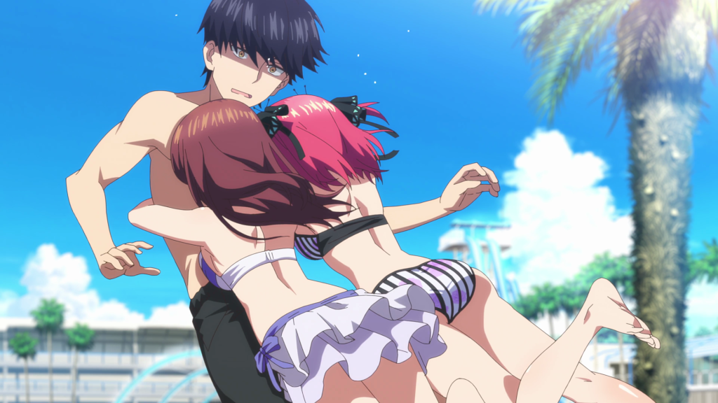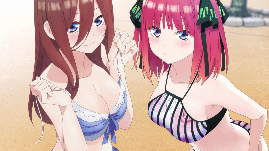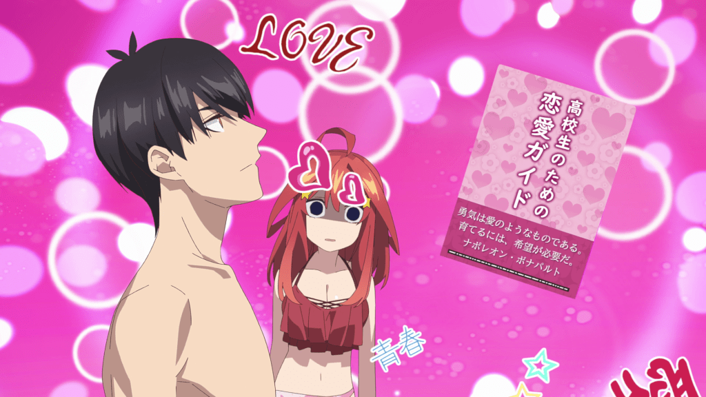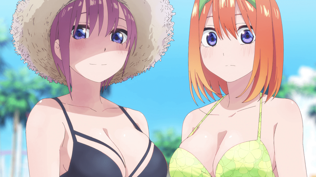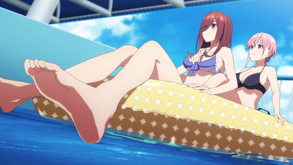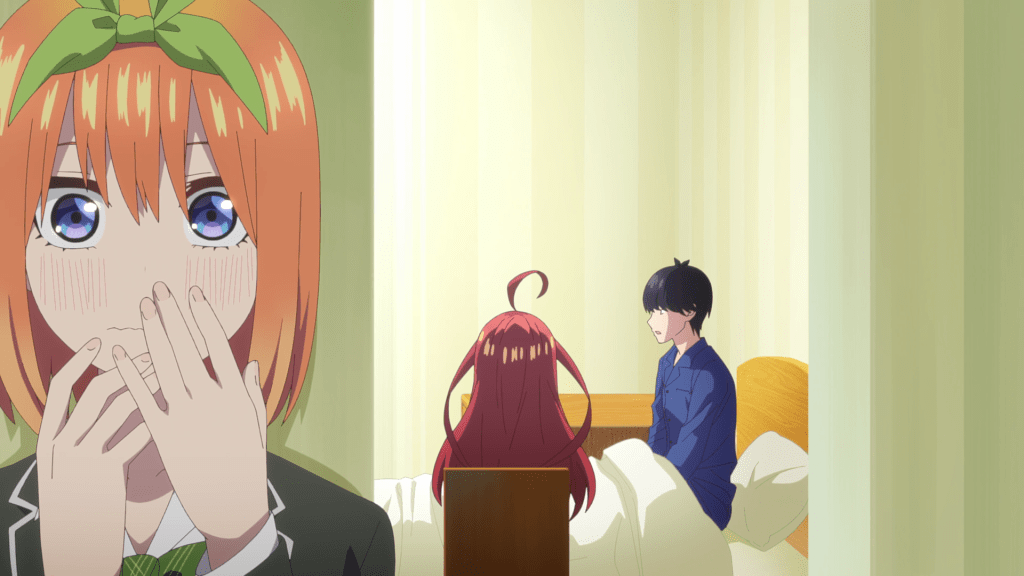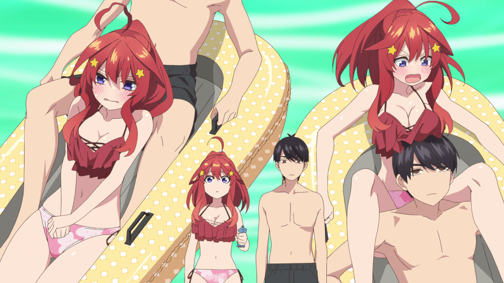 Episode 2 starts with Futaro and the quintuplets’ trip to a swimming pool. The movie does adapt this scene, albeit in a brief montage with its opening theme. From the movie version, you would think all there is to this scenario is fanservice and abridging it was an easy decision. As it turns out however, there is actually some character discourse to be found here. The trip to the pool is the first major group interaction between Futaro and the quintuplets after the Kyoto trip. Considering how the previous adventure went, Itsuki is concerned that her sisters will get into catfights again. She initially tries to keep Futaro all to herself but that quickly goes south once the others find them. Fortunately for her sanity, everyone is getting along just fine. The only potential landmine is when the gang has to divide into pairs for the water slide and that’s thankfully and humorously resolved by some good old Rock, Papers, Scissors. I took for it the granted this when I watched the movie version but this is a nice reprieve after the tension seen in the Kyoto trip and before we get to the final arc.