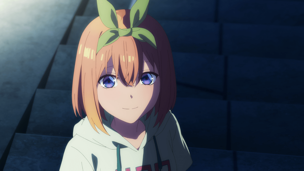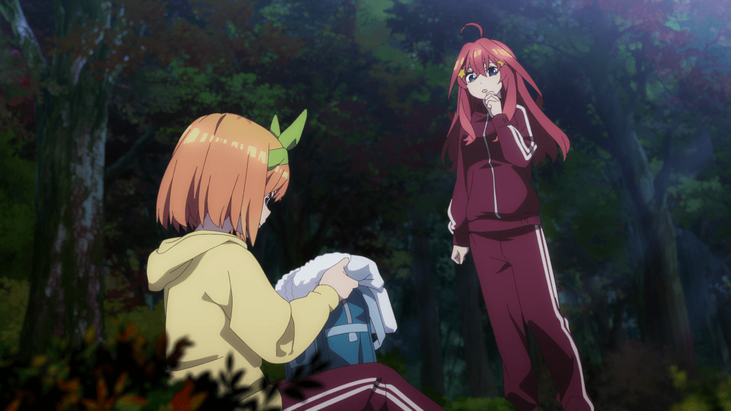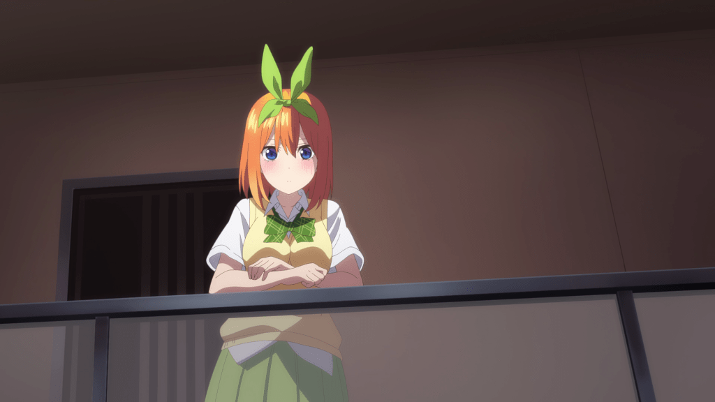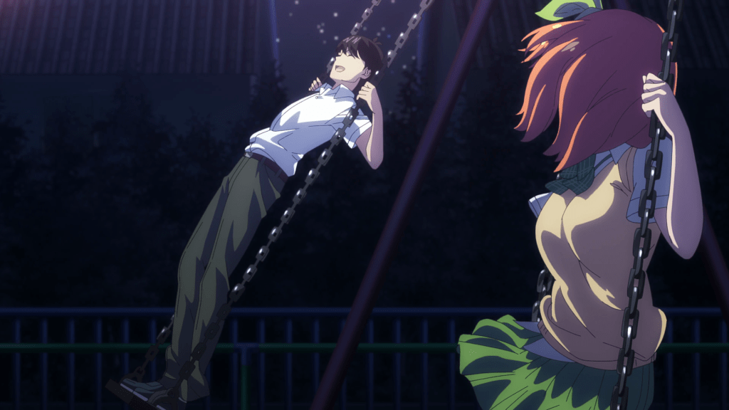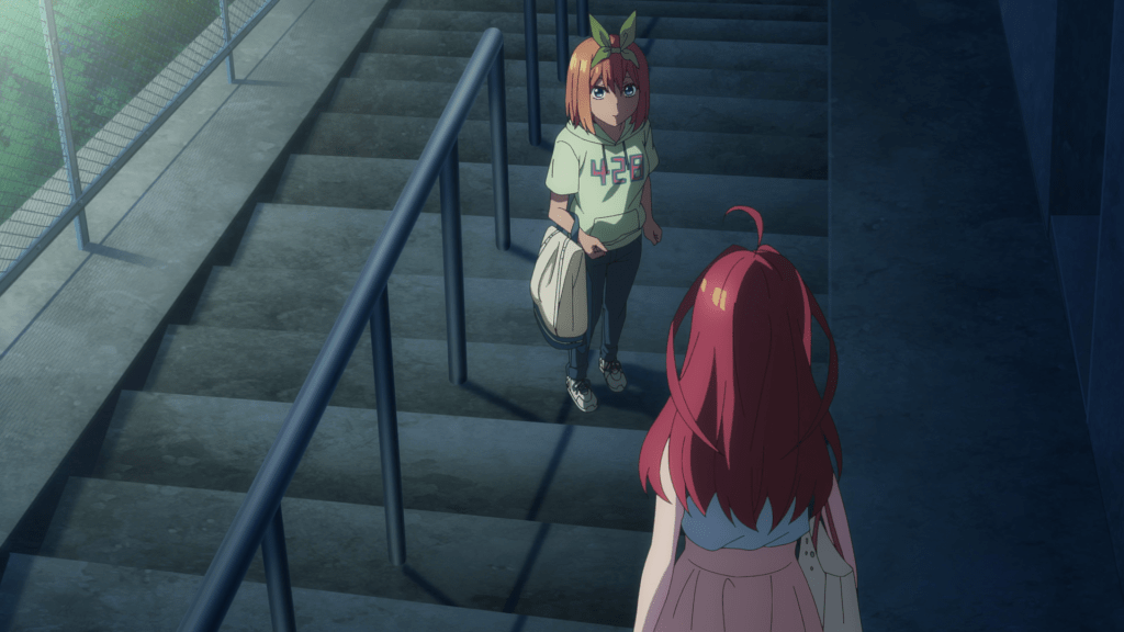 I love how the flashbacks keep cutting to Yotsuba on the swing. That was one of my favorite things from Season 2. Yotsuba mentioned that frequently visits that playground but this scene is the first time where we actually see how often she’s been there. It’s the perfect location to have Yotsuba internally contemplate on her love for Futaro and the race that her sisters have created for themselves. Also, seeing that unused swing next to hers, really conveys the loneliness or emptiness she’s feeling.