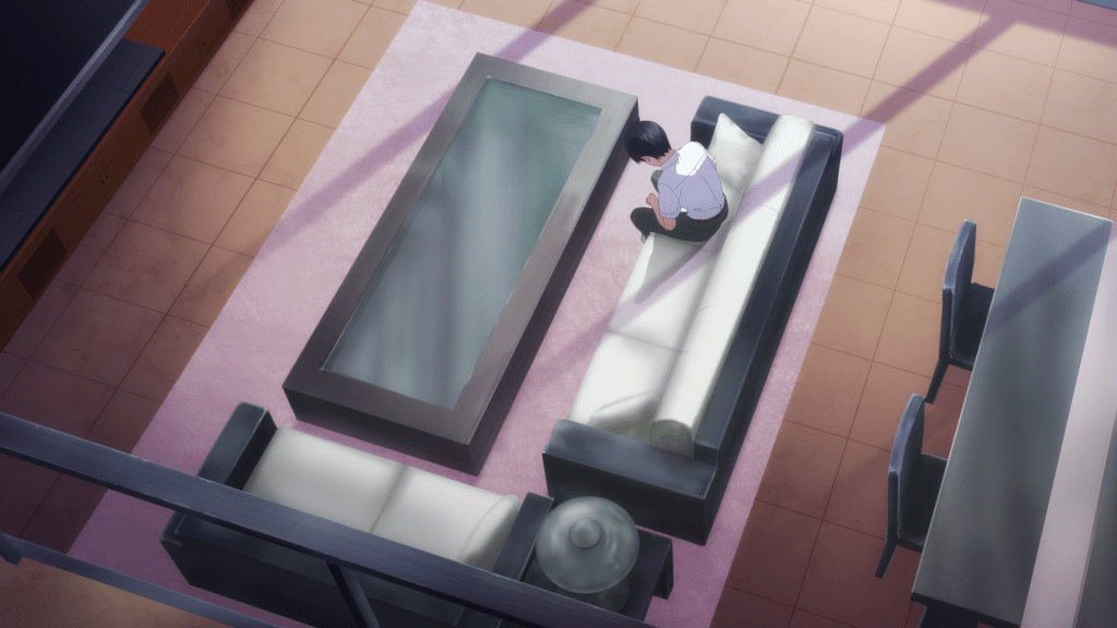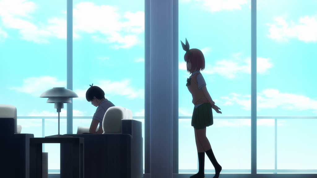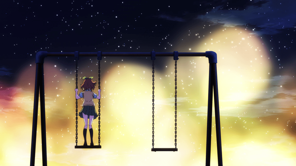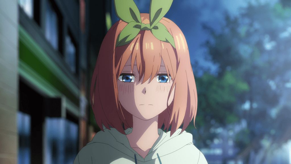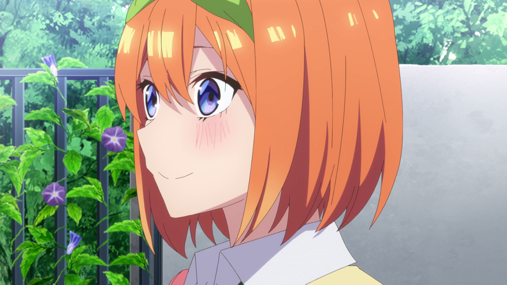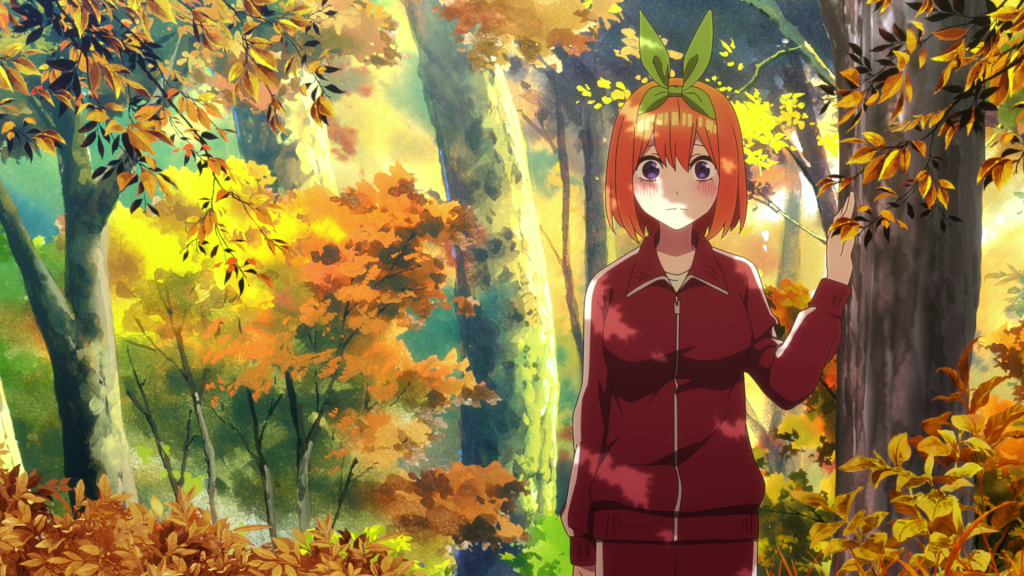 I love how the flashbacks keep cutting to Yotsuba on the swing. That was one of my favorite things from Season 2. Yotsuba mentioned that frequently visits that playground but this scene is the first time where we actually see how often she’s been there. It’s the perfect location to have Yotsuba internally contemplate on her love for Futaro and the race that her sisters have created for themselves. Also, seeing that unused swing next to hers, really conveys the loneliness or emptiness she’s feeling.