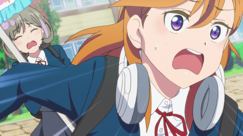 Superstar begins by introducing us to Kanon Shibuya (Sayuri Date), a Tokyo resident beginning her first year in high school. She has orange hair so there’s a 99.9% chance that she is the main protagonist of the show. Kanon is a talented singer but she also has a bad case of stage fright. Because of the latter trait, Kanon fails the entrance exam for the music program of her school of choice, Yuigaoka Private Girls High School, and she gets enrolled in the school’s general curriculum instead. Demoralized by her failure, Kanon is begrudged to pick up singing again. On her first day at school however, she meets Keke Tang (Liyuu), a half-Japanese and half-Chinese transfer student from China who wants to start a school idol club at Yuigaoka. Keke overhears Kanon’s singing on their way to school and she becomes so enamored with it, that she immediately wants Kanon to join her prospective club.