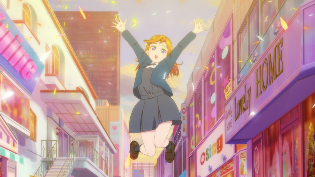 Being the first episode of the series, we of course get the obligatory MV at the end. Oddly enough, the MV features all five main characters performing together. I’ve long accepted that Love Live! takes liberties with the continuity when the music starts playing (and that’s putting it mildly) but this is a weird move. Like, imagine if Sunshine’s first insert song had all nine members of Aqours, before any buildup and development is spent to band them all together. It’s a big deal when everyone performs together for the first time so I’m stunned to see Superstar do it from the get go, before its cast unites and before the club actually begins to exist. I would’ve preferred it if the episode opted for a solo performance by Kanan or a duet by her and Keke. Regardless, the song is catchy and in-universe, it’s a good excuse to have Kanan performing out in public and make her realize that she can overcome her stage fright.