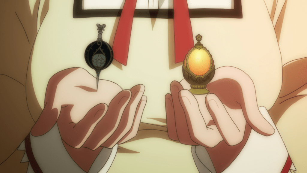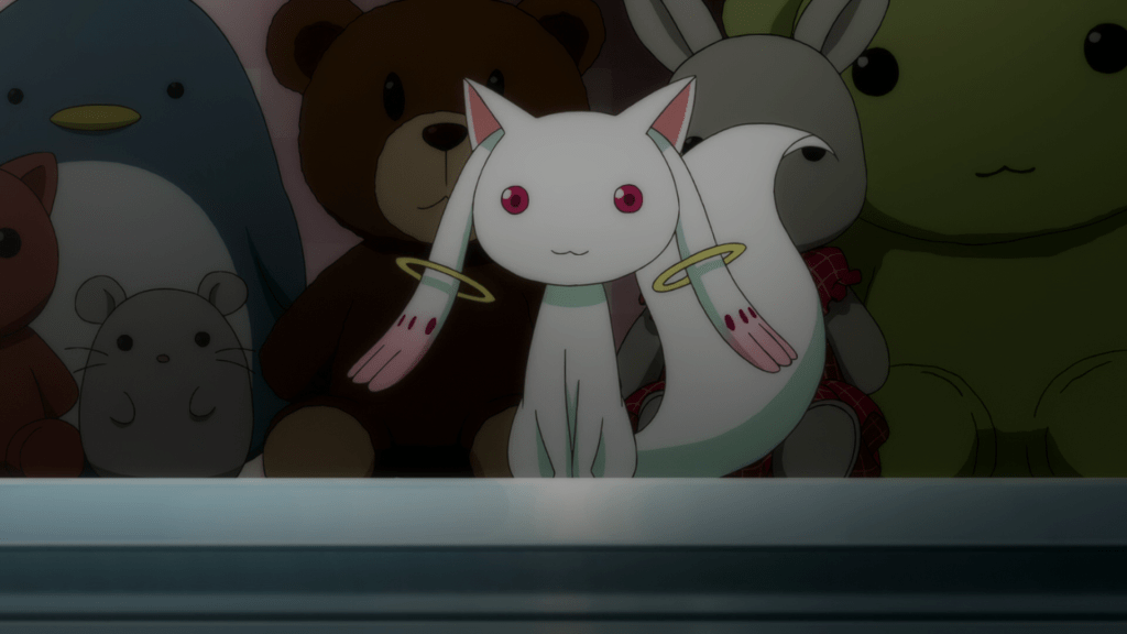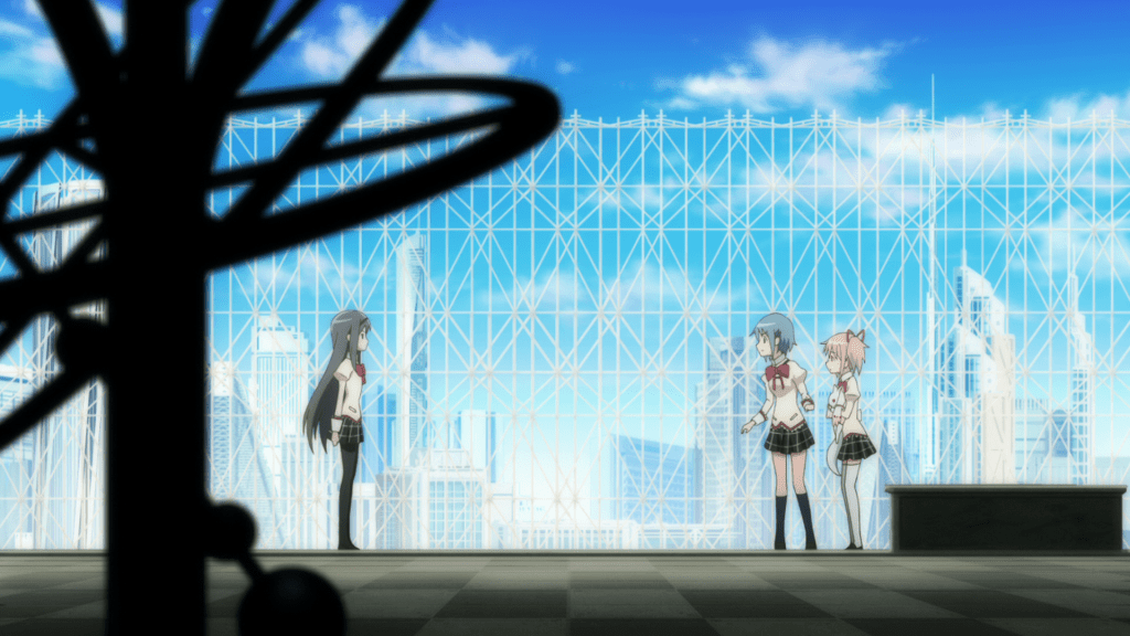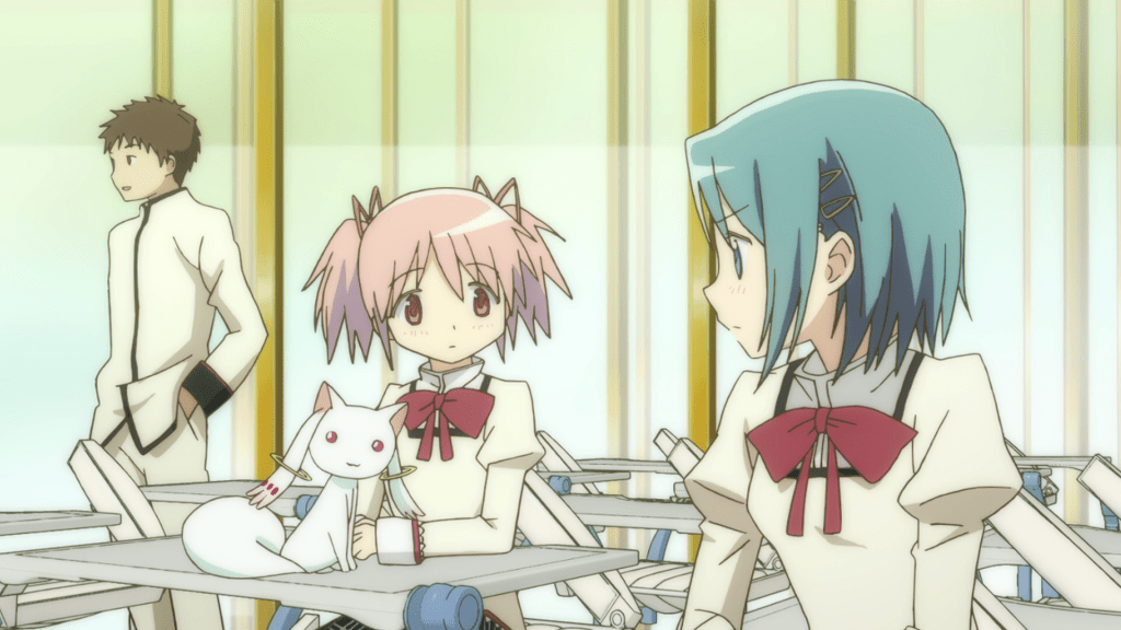 This episode treats us with some worldbuilding. Following the fight from the last episode, Mami and Kyubey explain to Madoka and Sayaka that the monster they encountered is called a Witch. Kyubey has the ability to grant wishes and those who make one become magical girls and hunt Witches in return. The source of a magical girl’s power is a little item called a Soul Gem. Later in the episode, we learn that Witches usually drop an item upon their defeat called a Grief Seed and magical girls can use this to replenish the energy in their Soul Gem.
