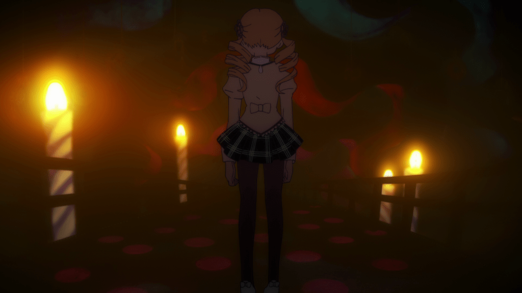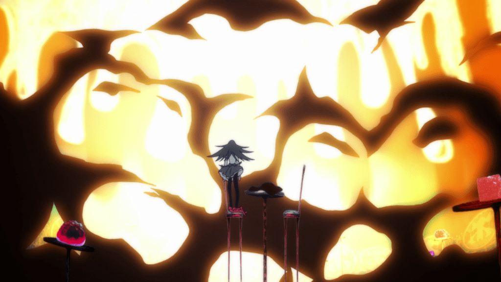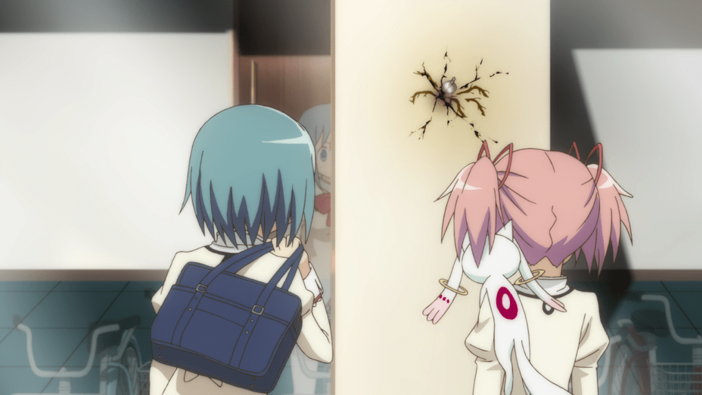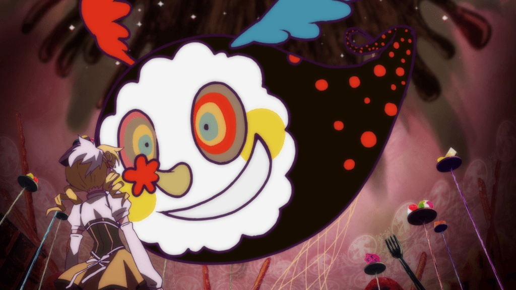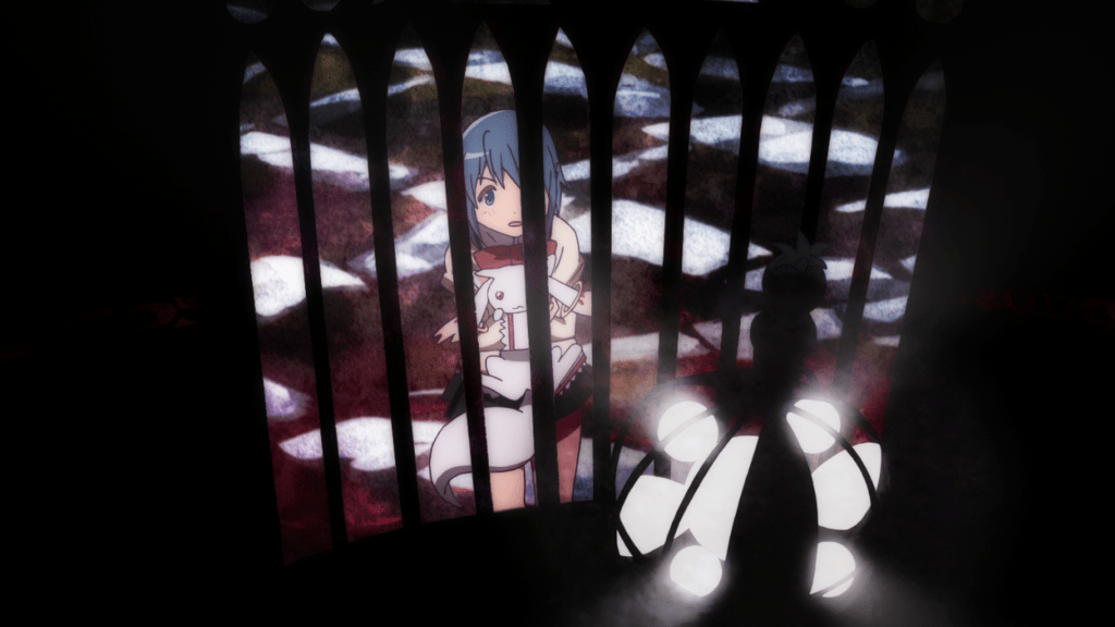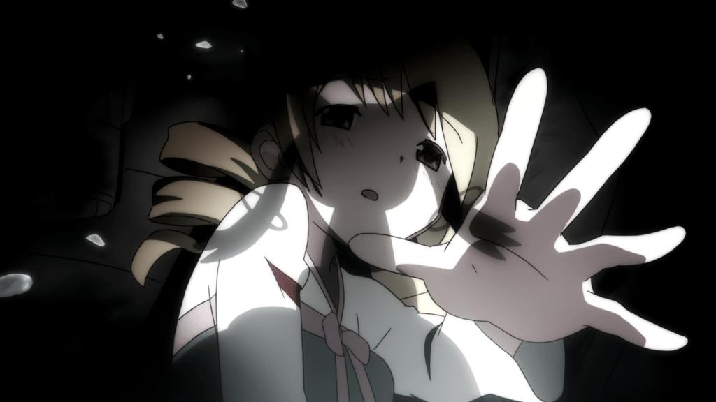 What also stands out is how unceremoniously Mami is killed off too. Charlotte revealing its true form is a dirty trick but it’s extremely believable as why would it play fair in the first place? And the attack happens so quickly too. The death flags may be there but you’d think it’d be a long and grueling fight before Mami finally bites the dust. She instead dies the instant the tables are turned on her. Let’s not forget the manner in which she dies either. Mami is seemingly decapitated and devoured by the witch and that’s disturbing enough on paper but the direction makes it even worse. There’s no blood or gore. In one shot, you see Charlotte open its jaws right in front of Mami. In another, you see Mami’s now lifeless body revert back to its civilian form but with the head perfectly framed out. Its silhouette then falls to the ground and the “camera” cuts away right as Charlotte mangles it even further. Anything graphic is left to your imagination and the scene is more powerful that way.
