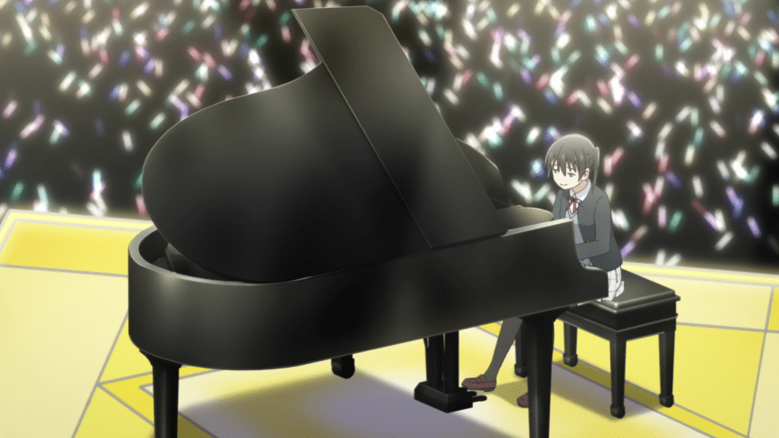 In contrast to the highly stylized MVs that are usually seen in Nijigasaki, the club’s performance this time around is played pretty straight, akin to the MVs in other Love Live! series. I’m not sure what the reasoning is here but the sequence is very well animated so I don’t really mind the change. What does baffle me is the lack intercutting between the idols performing on the stage and Yu playing the piano opposite of them. That undermines Yu’s decision to perform with her friends. At least it’s a nice image to bookend the MV as well as a cheeky easter egg as I believe Hinaki Yano does something like this during Nijigasaki‘s live shows.