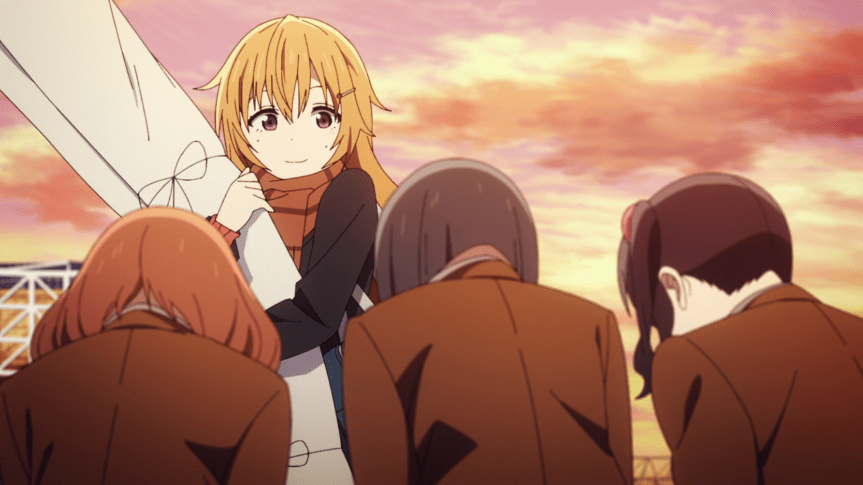 While the club prepares for their concert, Yu is contemplating if she should participate in an upcoming musical composition contest after seeing an advertisement for it. Parallel to that, Ayumu receives an email from a fan in London of all places. This then gives Ayumu the idea of studying there via an exchange program. Both girls are hesitant to pursue these respective endeavors, let alone tell each other about them, in fear of growing distant from each other. This is similar to the drama seen at the end of Season 1 though I do think it’s done a lot better here. At least time around, the feeling is mutual and Ayumu isn’t throwing a fit.