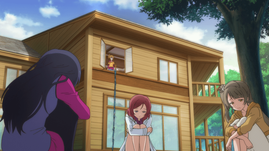 Maki conveniently has a piano in the villa for her to use while brainstorming on music composition. She also provides Kotori and Umi with their own rooms so that they can better concentrate on designing costumes and writing lyrics respectively. Unfortunately, all three girls find themselves in a creative slump and can’t come up with anything for a new song. I love how in Umi and Kotori’s case, the show makes it look like they’ve gone insane. I really want to know what went down in their respective rooms that they left such concerning notes for their friends to find. Funnily enough, Eli is immune to this slump. In fact, Eli isn’t brainstorming anything at all this episode. I find that strange considering that she is the club’s dance choreographer. Maybe she’s preoccupied leading the actual training part of the training camp. Maybe she’s waiting for the song to be done before thinking of any choreography. Either way, it’s a missed opportunity to not lock her up in a room and have her go insane, like with Umi and Kotori.