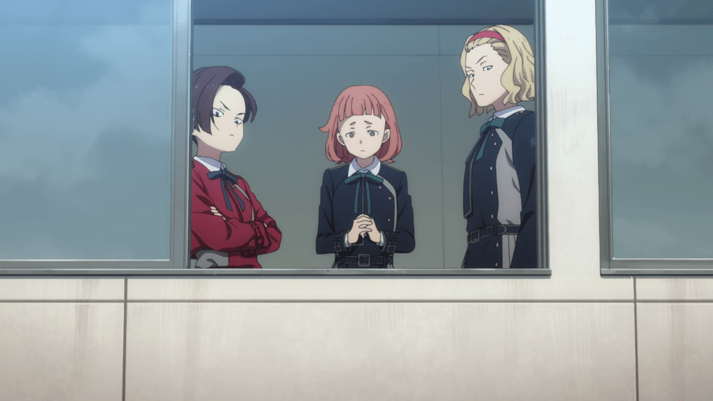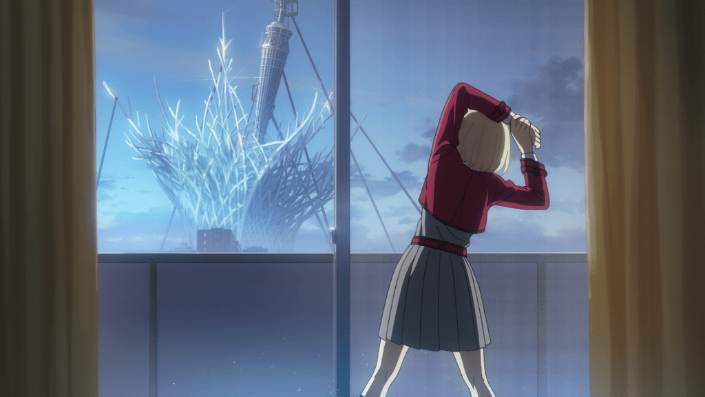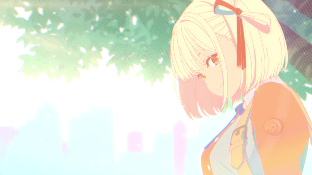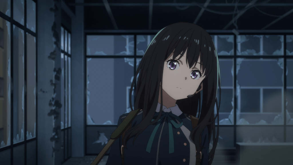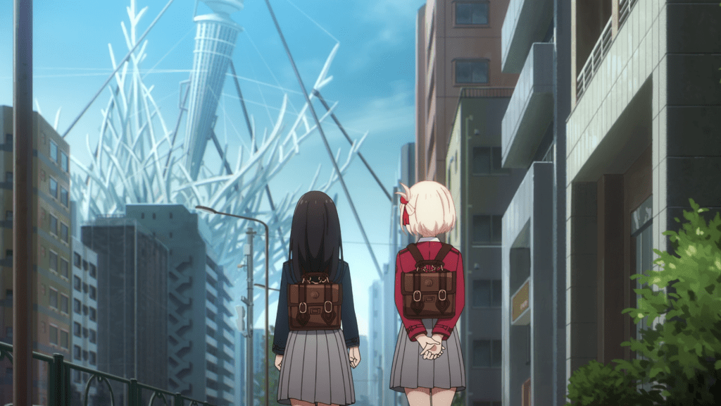 There’s a lot of intrigue surrounding Chisato. When asked by Takina regarding why she’s assigned to LycoReco, Chisato explains it’s because she’s the DA’s “problem child”. As the episode progresses, you start to see why she refers to herself as such. Despite working as a Lycoris, Chisato seems happier and prouder with the lower stake stuff she does for her community. The fight scene reveals Chisato prefers to use non-lethal methods and that includes the type of ammunition she uses for her gun. Evidently, Chisato follows the beat of her own drum. As to how she came to be this way, that remains a mystery though one bit of backstory mentioned in the episode is a great battle between Chisato and a group of terrorists that took place in a radio tower, the remains of which can seen in the background of several shots. Apparently, the tower’s remains are a symbol of peace but I’m convinced that it may also speak of Chisato’s character, suggesting that she chose to turn a new leaf after what happened in the tower.