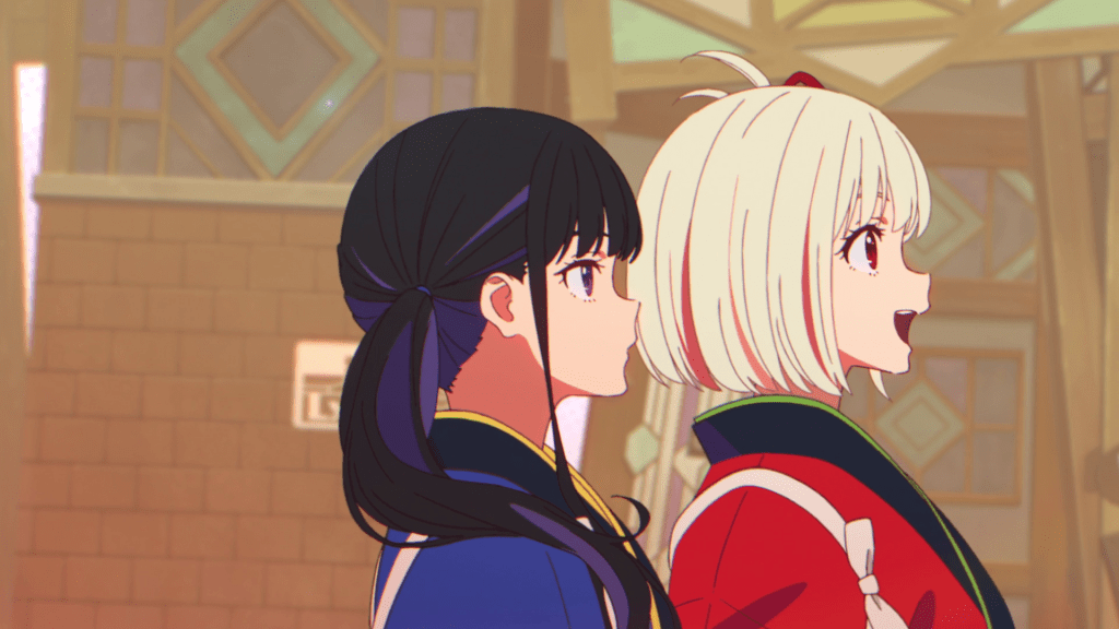 As far as I can tell, Lycoris Recoil is a cute girls doing cute things anime where one of the cute things said girls do is a rather violent profession. The show takes place in a fictionalized version of Japan where public safety is monitored by a secret organization called “Direct Attack” or “DA” for short. The agency deploys “Lycoris”, highly trained orphaned teenage girls who fight crime behind the scenes with lethal force. At the start of the show, Lycoris agent Takina Inoue (Shion Wakayama) is transferred out of her team after disobeying orders and acting recklessly during a mission. She now reports to Café LycoReco, one of DA’s front operations. The café consists of owner Mika (Kosuke Sakaki), former DA agent Mizuki Nakahara (Ami Koshimizu), and top-tier Lycoris Chisato Nishikigi (Chika Anzai). Partnered together, Chisato and Takina perform their regular duties as Lycoris while also waitressing for the café and performing community service.