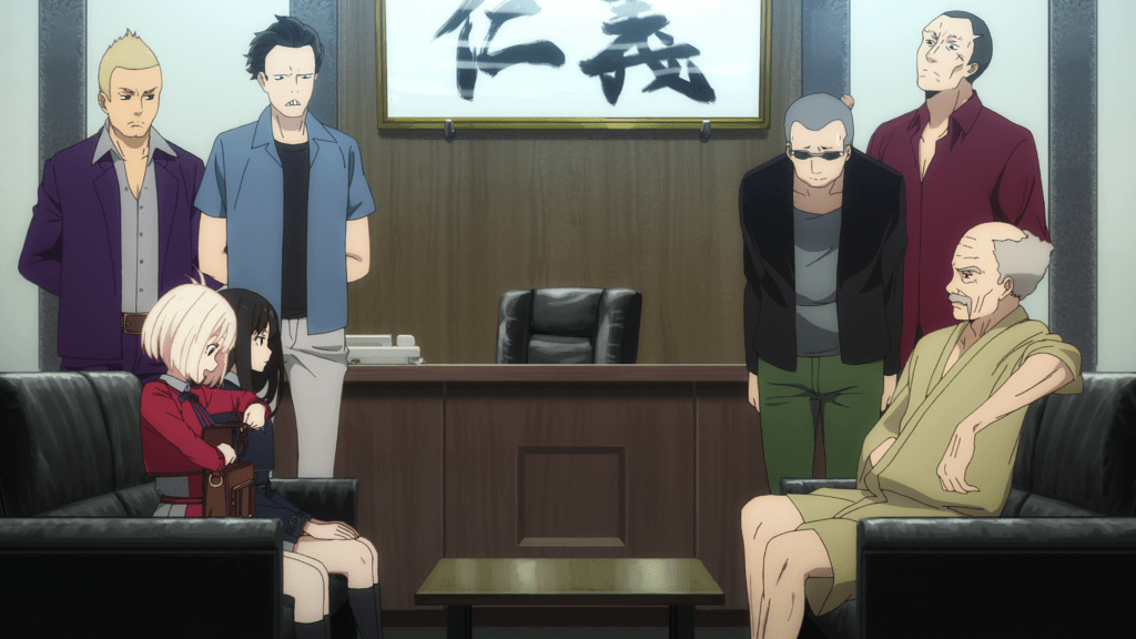Thing is, the first episode is rather lighthearted as it progresses. The middle act has Chisato showing Takina the different things she does outside of her regular Lycoris duties such as assisting various schools and performing deliveries for LycoReco. Along the way, they meet all sorts of folk, including a group of Yakuza whose leader is a regular customer of the café. The third act is where the action kicks back in as it has Chisato and Takina accepting a request from the police to bodyguard a woman from a stalker. Oddly enough, the odd job connects to the main plot as it turns out that the woman just so happened to have taken a picture right around where Takina’s last mission took place, making her stalker a much more serious threat. The fight scene itself comes across as “fun”, what with the upbeat music that plays as Chisato makes short work of the enemy. The overall tone of the first episode is strange but I’d be lying if I said it didn’t help keep me engaged.