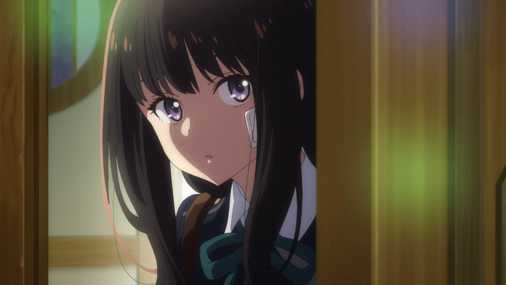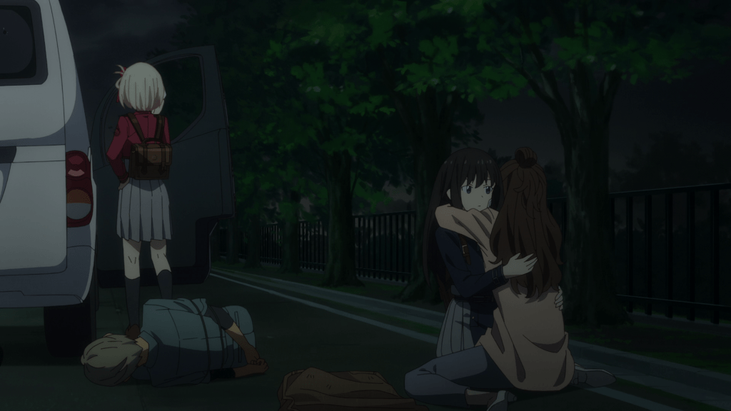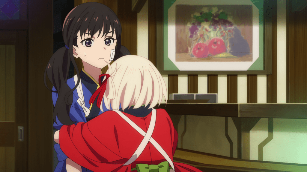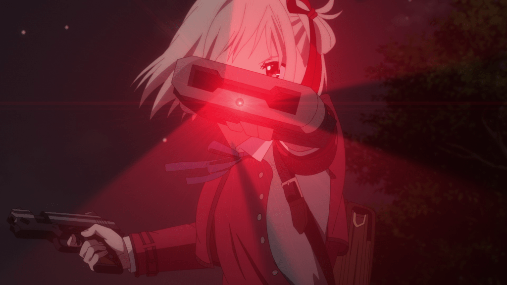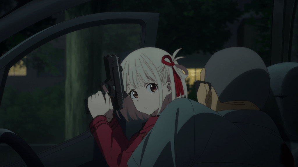 This premiere also establishes a couple of overarching plot. The first relates to Takina’s previous mission, the one that gets her transferred to LycoReco. The goal was to stop an arms deal but all the weapons in that transaction has gone missing. Along with that, the DA is also investigating “Walnut”, a hacker that managed to breached their systems during Takina’s mission. At the end of the episode, Walnut gets murdered by the man who hired them. That man then stops by LycoReco and he appears to be acquainted with both Mika and Chisato. I don’t know want to say none of this wasn’t interesting but they surprisingly weren’t where my attention gravitated towards. Perhaps as the show continues and I get better grasp on it, these threads will click for me more.