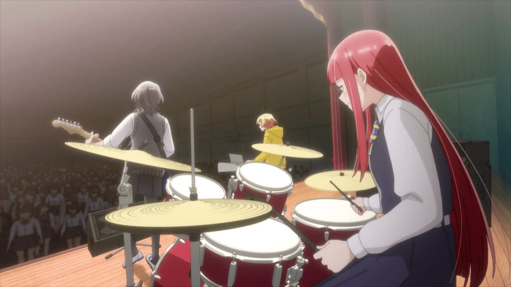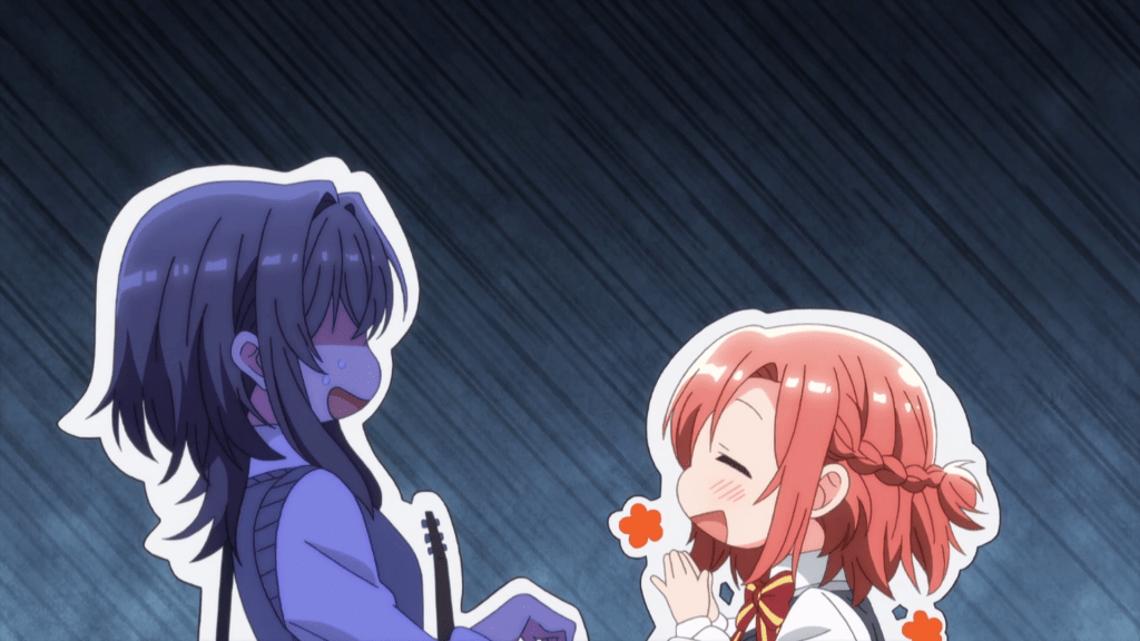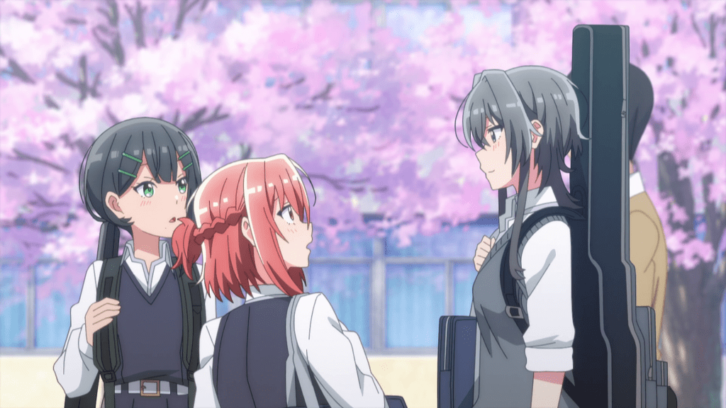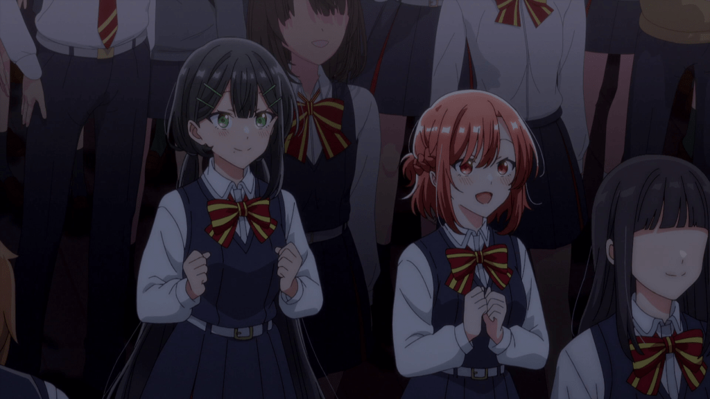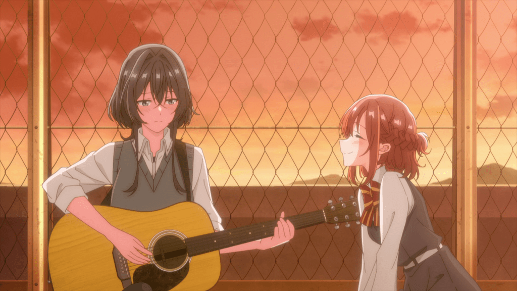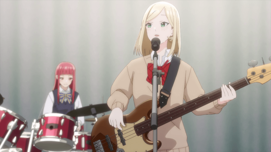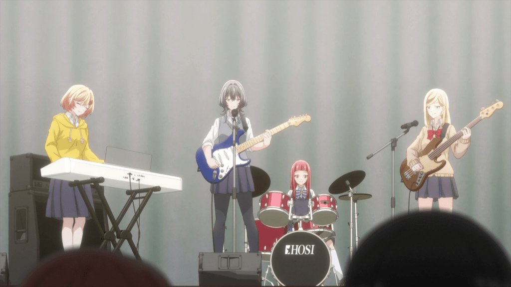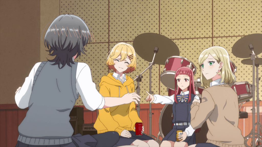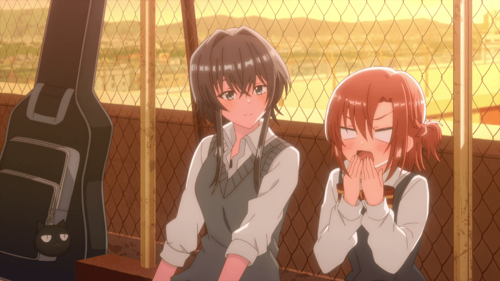 Aside from the main duo, I also like the SSGIRLS gang. They’re a fun bunch for Yori to bounce off of when she’s not spending time with Himari, cheering their honorary member on while giving her some whacky ideas for her to consider. I’m curious about the exact relationship between Mari Tsutsui (Konomi Kohara) and Kaori Tachibana (Ai Kakuma), the drummer and keyboardist for SSGIRLS respectively. The two are childhood friends and Kaori acts very chummy and flirty around Mari. Maybe they’re just there to yuri bait the audience while the actual romance is developing but it would be interesting if they really are a couple. I have something to say about Aki but I’d save for the Episode 2 review.