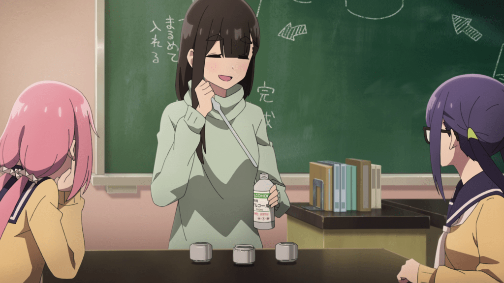 To Chiaki’s credit, the DIY project this time around is very useful. Here, the girls create some alcohol stoves with aluminum cans that they can obtain from their school’s vending machines. Definitely the cutest and funniest moment is Nadeshiko struggling to correctly puncture her cans, resulting in her using a saw on a steel can. Once Toba-sensei (Shizuka Ito) tests them, the makeshift stoves prove to work without a cinch. That said, Toba-sensei asks the girls to refrain from using the cans as she’s afraid that they might cause a fire with them (having done so herself…). Maybe the club (and Ena) will use these stoves? Maybe they won’t? I’m frankly leaning towards the latter because their track record with these projects has been very lousy so far.