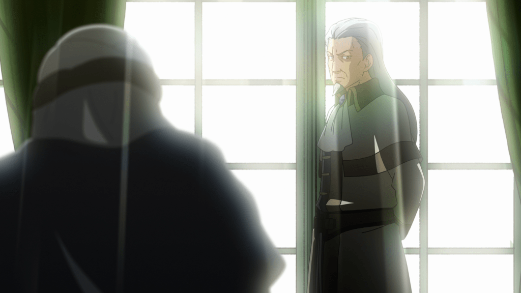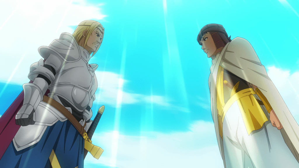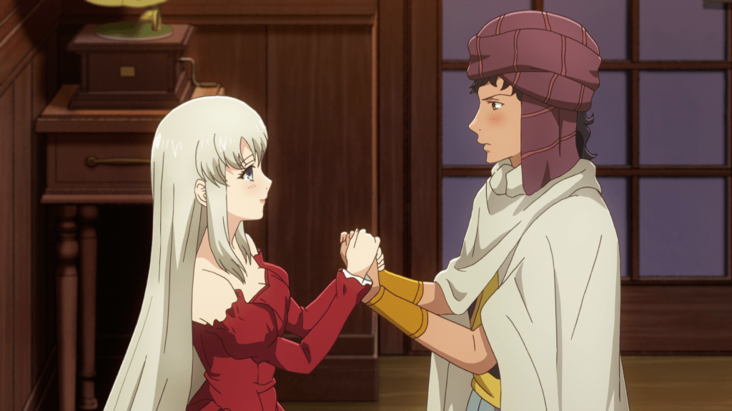 In the penultimate episode, Shareef finally establishes formal relations with the Great Empire, led by Adelheid’s family. He first sends a teapot with the magical ability to cool down coffee as a gift to the emperor and Adelheid’s father, Wolfgang (Jouji Nakata). Impressed and flattered by the gift, Wolfgang travels the Land of Sand to talk to Shareef about an alliance. This catches the attention of the neighboring kingdom (I want to say the demon kingdom where Aletta lives); they worry that a war with the other nations is imminent. Edmon (Susumu Chiba), the kingdom’s chief of intelligence and not to be confused with Fardania’s father Edmond, is tasked with getting further information on the situation.