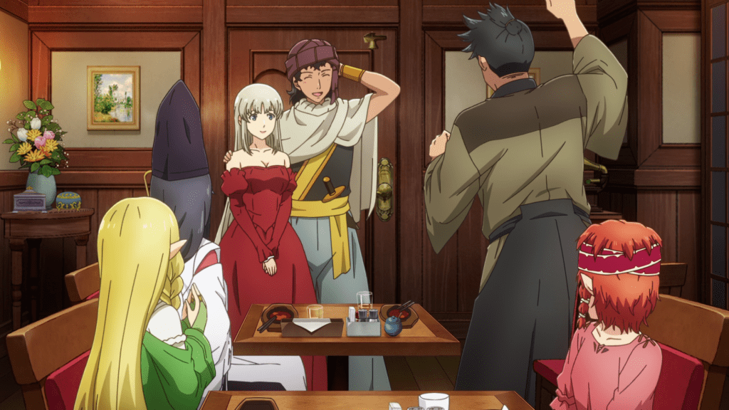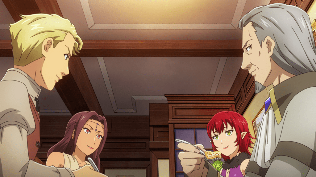 The four patrons have to wait longer than usual as the Master has a long queue of orders to get through. I’m shocked that this doesn’t happen more often as Nekoya seems packed most of the time but whatever. To tide them over, the Master offers the four some quiche to enjoy. Kind of like with the teriyaki burger last episode, the nice thing about this dish is that it has ingredients that each of the patrons are fond of, such as shrimp and cheese. Lastina’s interest in the potatoes used in the quiche is maybe the one outlier, if only because the last episode associated her with coffee instead. Obviously, the patrons’ favorite ingredient is what gets each of them interested in the quiche but in a neat little twist, they end up praising the dish for something else. I’ll always love the patrons’ crippling addiction to one particular dish but this bit of unison is very refreshing to see. Funnily enough, Edmon is enjoying the food so much that he almost forgets the very serious and political reason he’s at Nekoya. I guess it goes to show how wholesome and how contagious the vibes are there.