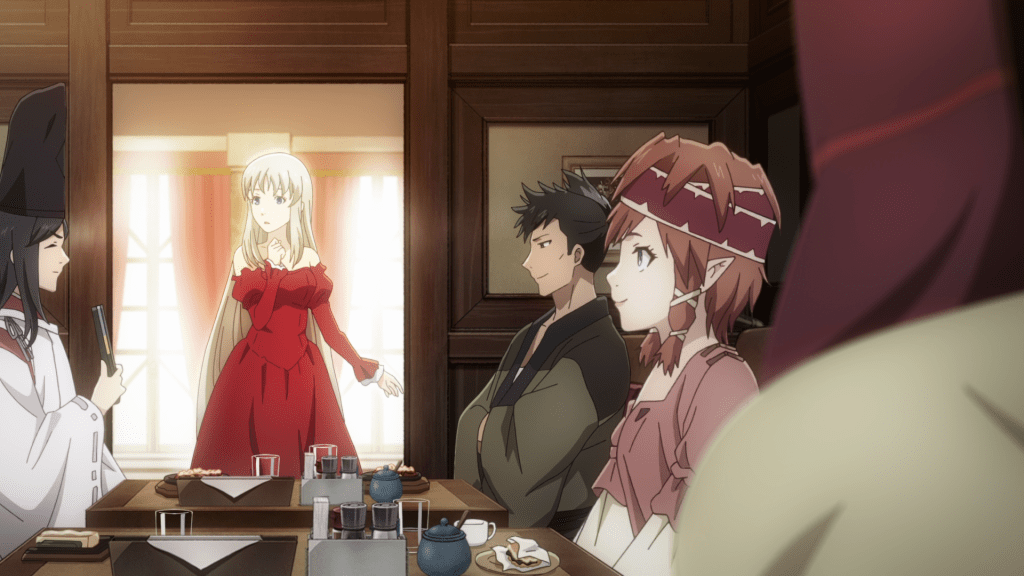 At Nekoya, the place is swarmed with various patrons so Edmon shares a table with Heinrich (Tomokazu Sugita), Ranija, and Lastina. Having Edmon sit next to Lastina is kind of funny as the Demon Lord is the most likely tablemate to know what’s going on in the Empire. Frankly, I’m a little confused how Lastina is the Demon Lord when she’s not the one Edmon reports to but she does live in the Empire so I guess she’s more of a liaison than an actual sovereign.