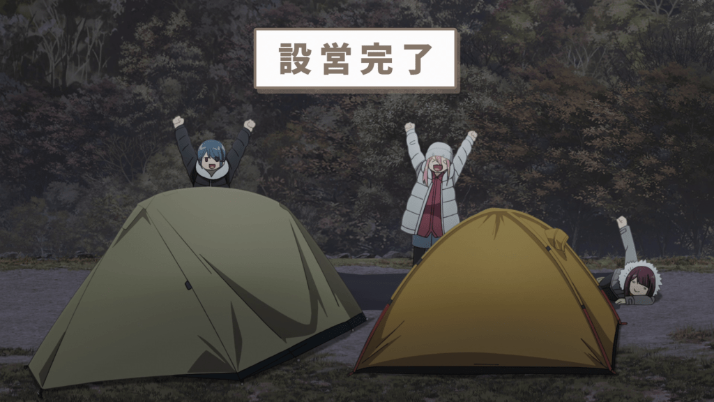 Around eight minutes into the episode, Rin and Ayano finally arrive at the campsite. I thought Ayano would be fine after having lunch but all the driving she’s done apparently still wears her out as she collapses onto the ground for the second time. I guess my prediction came true after all. It’d be really funny if this happens again the next time Ayano tags along. You then have Rin and Nadeshiko checking out Ayano’s camping gear and setting it all up for her. I laughed really hard when Ayano acts like she still did it while she’s lying on the ground. This girl never ceases to be funny (though really, who does in this show?). A missed opportunity here is not having Ayano look at her friends’ stuff in envy. I suppose she’s not too informed in this department but dang it, it’s fun when these girls inadvertently realize where they each stand in terms of budget.