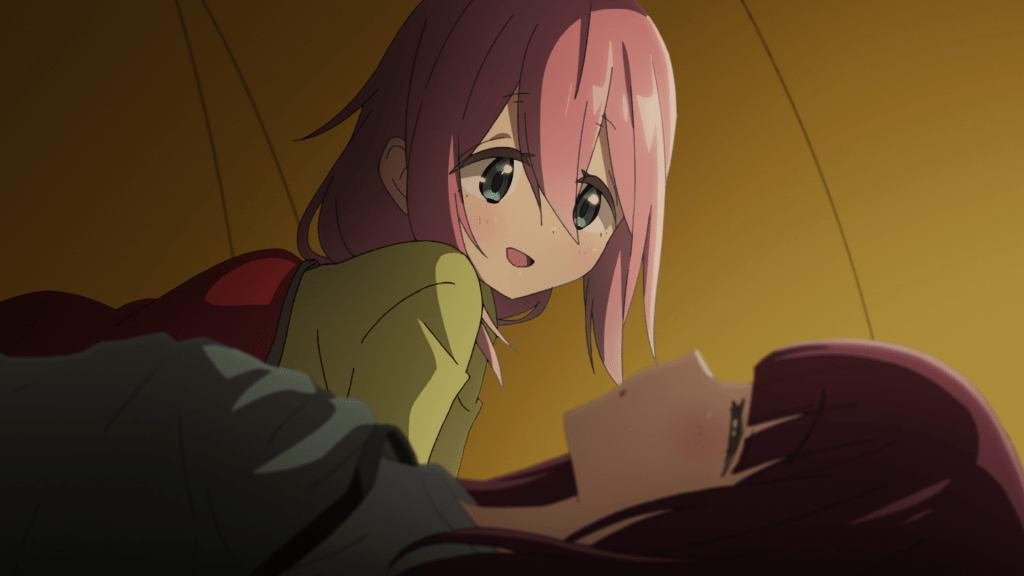 This episode is considerably less eventful than the past two. To be fair, the girls toured around a lot beforehand. Literally, the only thing left to do in this camping trip is actually going camping. We start with Nadeshiko biding her time. The first thing on the to-do list is setting up a couple of things, including some stuff Rin handed to her ahead of time. Definitely the funniest bit here is Nadeshiko trying out Rin’s billhook. She looks so darn silly with that thing. I can’t believe Rin entrusted that to Nadeshiko but then again, we saw the latter use a saw in the season premiere so I guess she can handle sharp objects just fine. We also see Nadeshiko experiment with her cooking. She first makes some amazake cookies for herself and she later comes up with a dam-themed curry rice dish inspired by a similar dish she tried earlier in the trip. I would love to see Nadeshiko go on a legit solo trip again. She’s proven herself to carry scenes on her own really well.