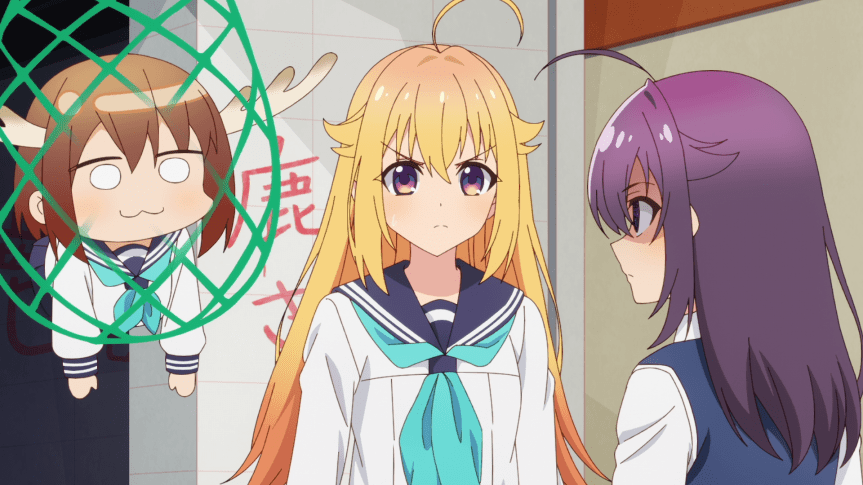 Episode 2 opens up with Torako lugging a cart full of stuff over to the Deer Club’s house. My first thought is that Noko requested for a lot of stuff for the clubroom (and by stuff, I really just mean deer crackers) and poor Torako ended up being the pack mule. Instead, everything Torako brings is stuff she bought so that she can better tolerate being in the Deer Club, which is a funnier punchline in my opinion. Unfortunately for Torako, the whole clubhouse gets trashed the next day. Naturally, Torako thinks Noko is behind this but it turns out that the real culprit is her younger sister, Anko (Rui Tanabe).