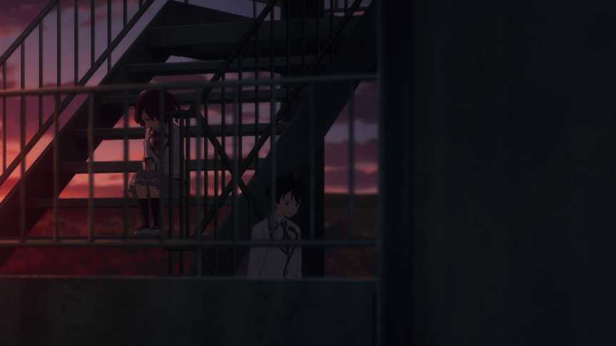 After the meeting, Kazuhiko goes looking for Chika with help from the others. When he finally finds her, Chika confides to him that she’s afraid of being left alone and she feels Kazuhiko is ostracizing her with his recent actions. Realizing that he didn’t account for Chika’s own feelings, Kazuhiko apologizes for stepping out of line and assures Chika that he won’t abandon her. Chika confiding to Kazuhiko via text is an interesting choice. She is comfortable with talking to him but by having her resort to her writing, the show conveys how much Chika wants her feelings to be known to Kazuhiko. Kazuhiko responding to and reconciling with her in the same manner is a very nice touch. And yeah, this scene does come across as rather romantic, especially given how Kazuhiko phrases his message. The show is of course noncommittal in the end but I do wonder if this scene might factor in that way down the line.