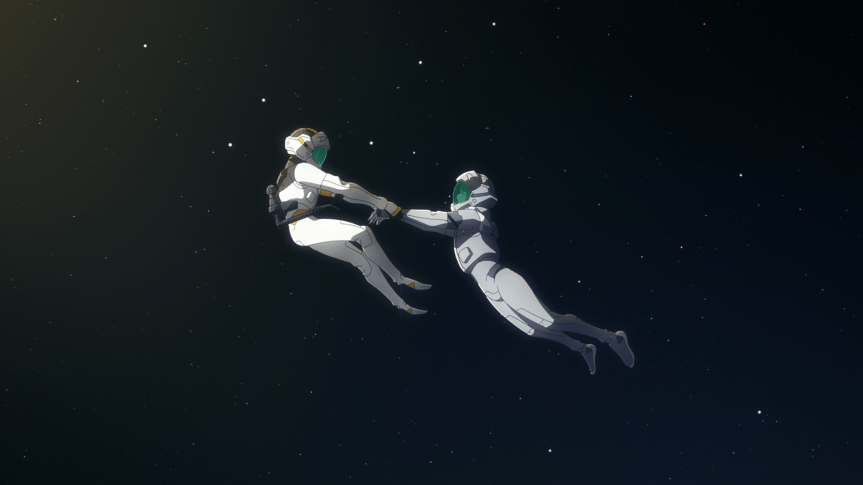 Per the conditions of the last duel, Elan challenges Suletta to a duel. If Elan wins, he gets ownership of the Aerial. Suletta isn’t sure what she should wager though fortunately for her, Shaddiq tells her that she has until the day of the duel to decide. It is also decided that the duel will take place in outer space. This creates another issue for Suletta as the Aerial lacks a thruster pack. To help Suletta out, Earth House scrounges some parts so that Nika can build some thrusters for the Gundam. Frankly, it’s really dumb that such tech wasn’t provided by Shin Sei beforehand but I suppose this setback lets us see Suletta’s affinity with Earth House pay off. This also creates an additional stake as Suletta not only has to defeat Elan for the sake of the Aerial but also her friends at Earth House.