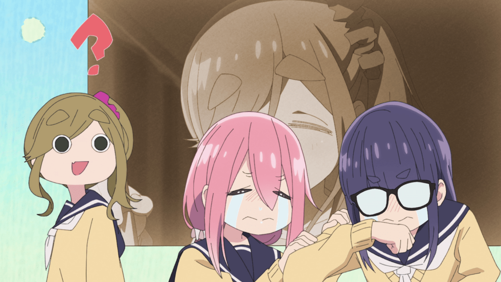 Personally, I find the food related stuff to be the weakest parts of the episode but then again, I think I’ve always been biased towards the characters’ financial struggle and Aoi’s lies. I love that Aoi cites Ena as a camper who burns money and picks Chiaki as a camper who can’t. Those are such apt choices that I can’t help but chuckle. A very great spin on Aoi’s lying, and also the best joke in the episode, is Nadeshiko and Chiaki worrying that Aoi is wasting her free time coming up with bits and feeling guilty that they’re not laughing at any of them. Not only is it hilarious to imagine Aoi spending entire nights writing down lies for her to share in the future, it’s also rich coming from Nadeshiko and Chiaki. I mean, all three girls clearly have too much time on their hands, hence this entire special.