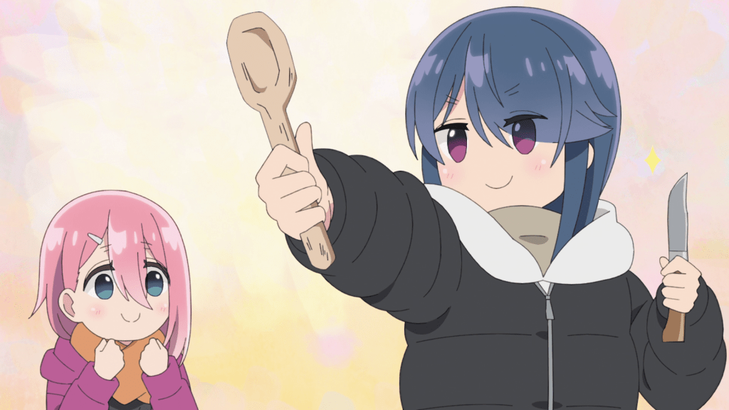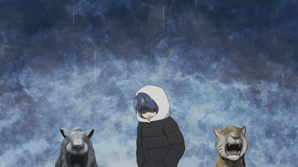 The rain-themed trip makes for a fun episode. To deal with the weather, Rin rents a tarp large enough to cover her tent and motorbike. This allows her to do some of her usual activities such as reading a book and warming up some food for herself. There are nevertheless some amusing setbacks that occur throughout the episode. Rin learns the hard way that she can’t go sightseeing unless she wants to get mud over herself. The tarp also backfires on her as the ground gets muddier and it causes the tarp to fall apart, forcing Rin to do some trial and error. It all sucks for Rin but it’s entertaining to me. You also get some other shenanigans such as Rin dreaming up an encounter with cryptids (I’m only now realizing that Rin dreams some pretty weird stuff) and her carving out a wooden spoon to impress Nadeshiko (knowing Nadeshiko, that probably is the reaction she’d give).