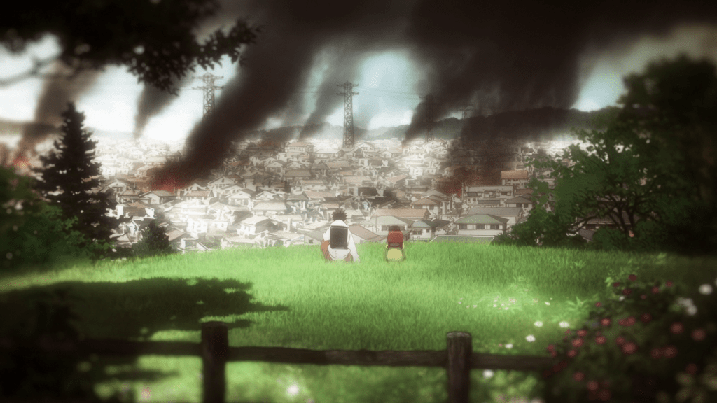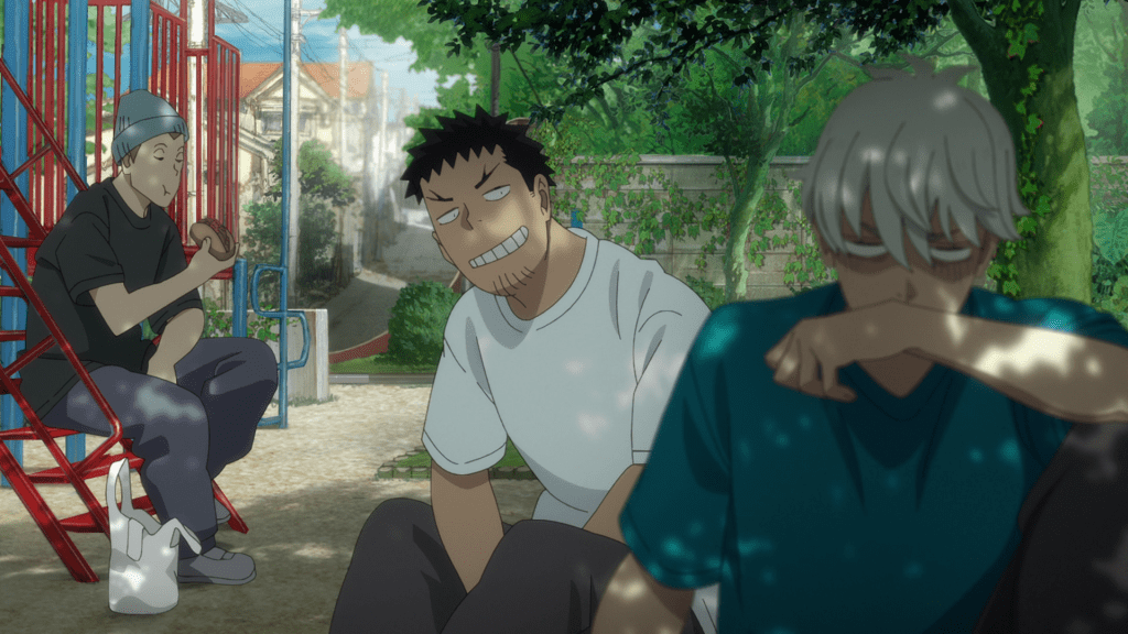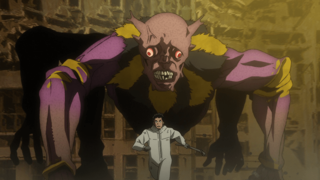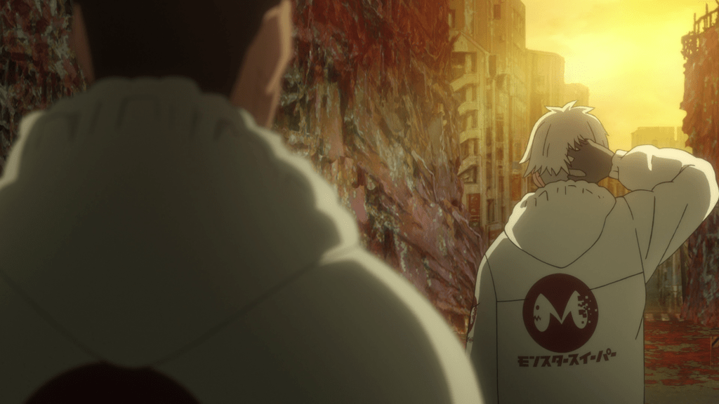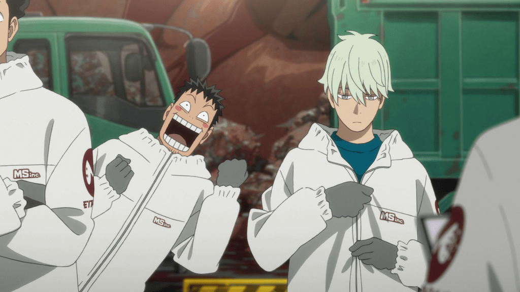 Kaiju No. 8 takes place in an alternate version of our world, in which kaiju frequently appear and wreak havoc. The show begins with a typical battle between one and the Third Division of the Japanese Anti-Kaiju Defense Force (JAKDF for short), the military organization in charge of combatting kaijus in Japan. In the aftermath, we see Kafka Hibino (Masaya Fukunishi; Megumi Han in certain flashbacks), participate in disposing of the kaiju’s carcass for his employer Monster Sweepers Inc.. The next day, he shows the ropes to a new recruit and an aspiring Defense Force operator, Reno Ichikawa (Wataru Kato). The two initially don’t get along after Reno learns that Kafka gave up on his dream to join the Defense Force but Reno gradually warms up to Kafka, thanks to the latter’s reliable and kind nature.